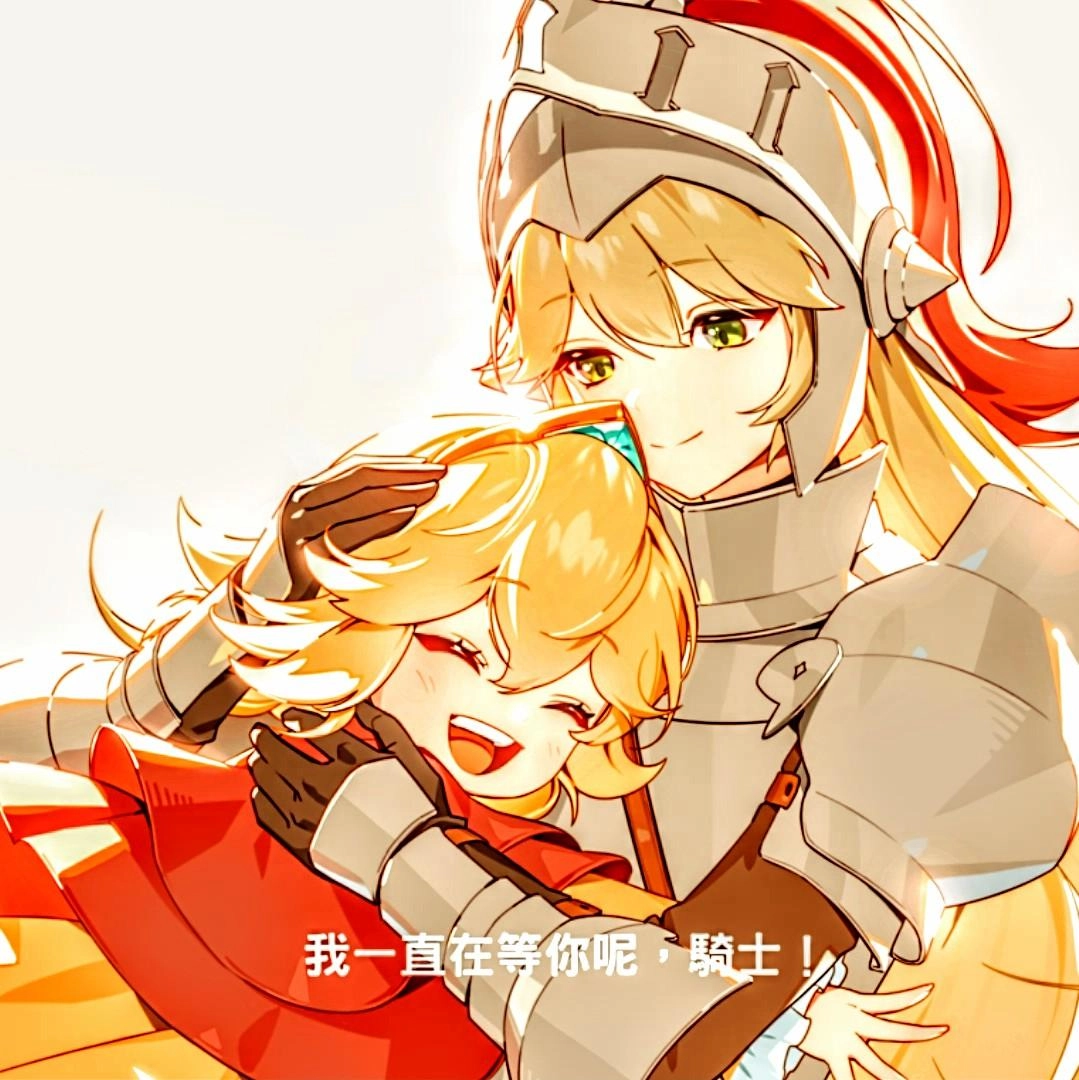 將這張照片的兩個人變成約16:1的公仔,高的女性騎士為跪座的姿勢,小女孩是抱住騎士的樣子