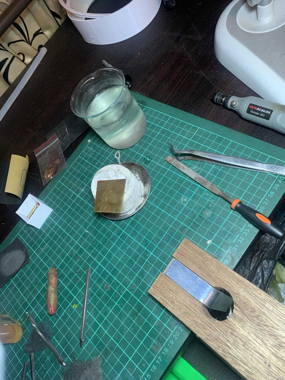 然後把做好的公仔放在電腦桌上面,並且在桌上還要加上一些金工會用到的材料(例如黃銅板),還有一些工具(例如游標卡尺和小型噴火槍)
