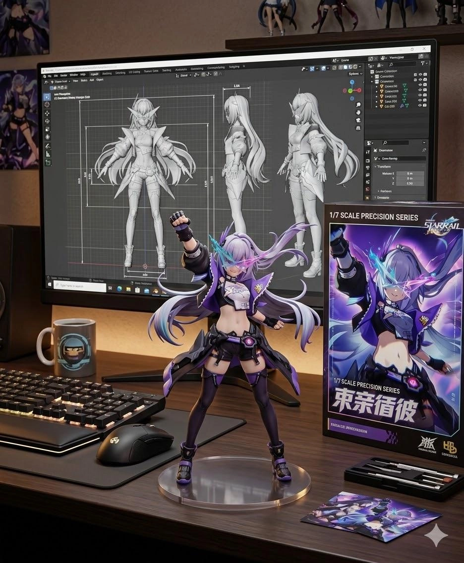 桌面上另外放置了鍵盤、滑鼠、咖啡杯,以及其模型盒,設計為市售收藏品風格,正面印有該角色的彩色動漫插圖,呈現完整的周邊商品氛圍。」
