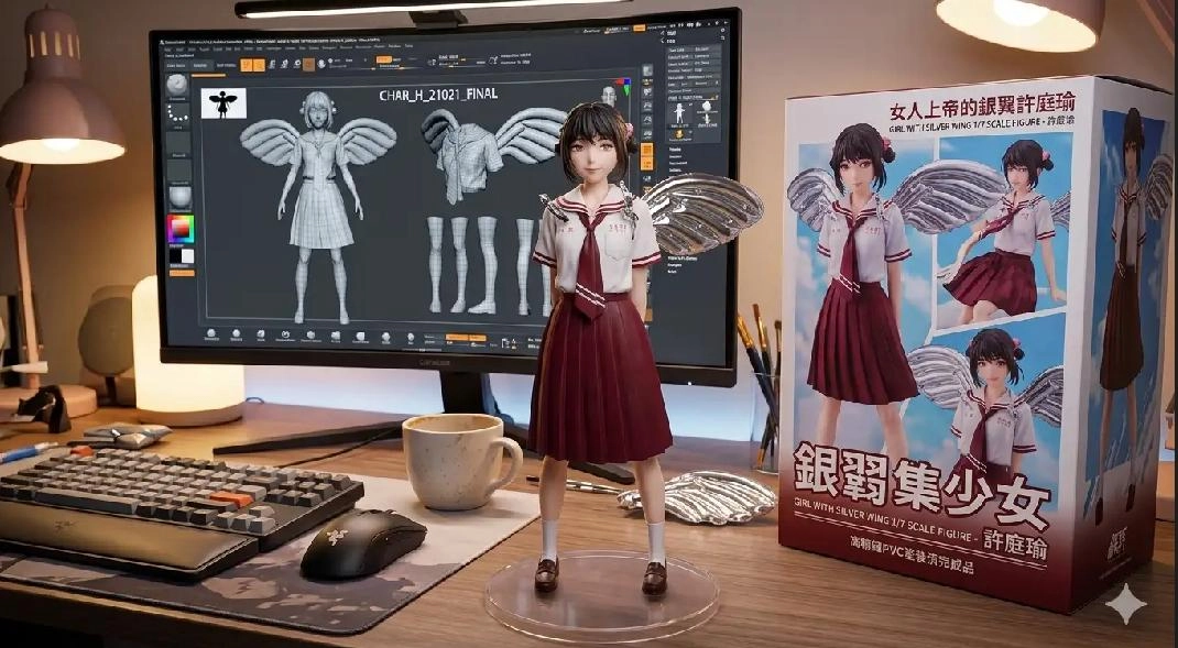 請用我提供的原圖,把圖片內主體變成電腦桌前的立體公仔。