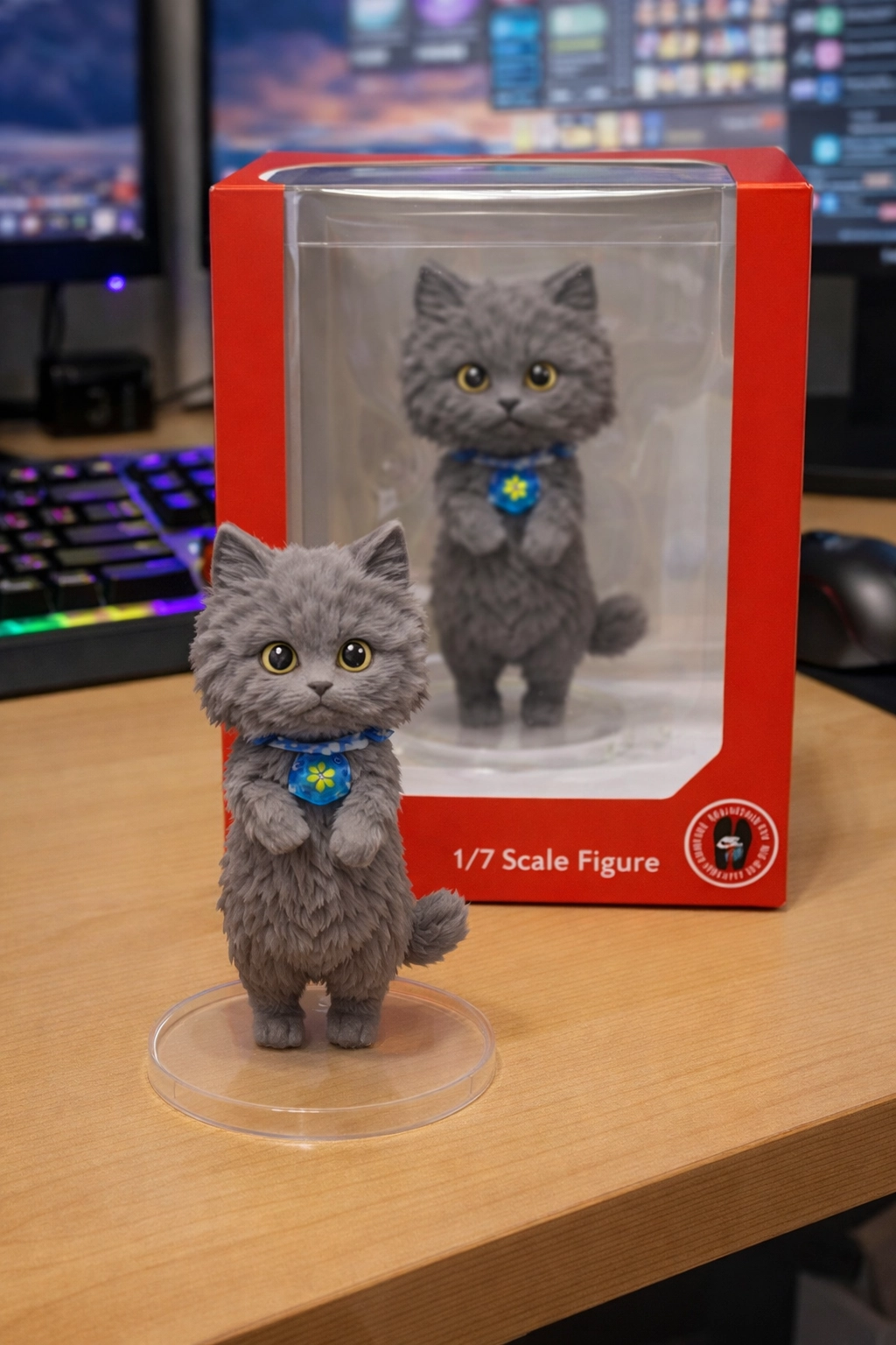 幫我把這張照片生成立體公仔的樣子把圖片內主體放在電腦前。場景為一張電腦書桌,上面擺放著一個1/7比例