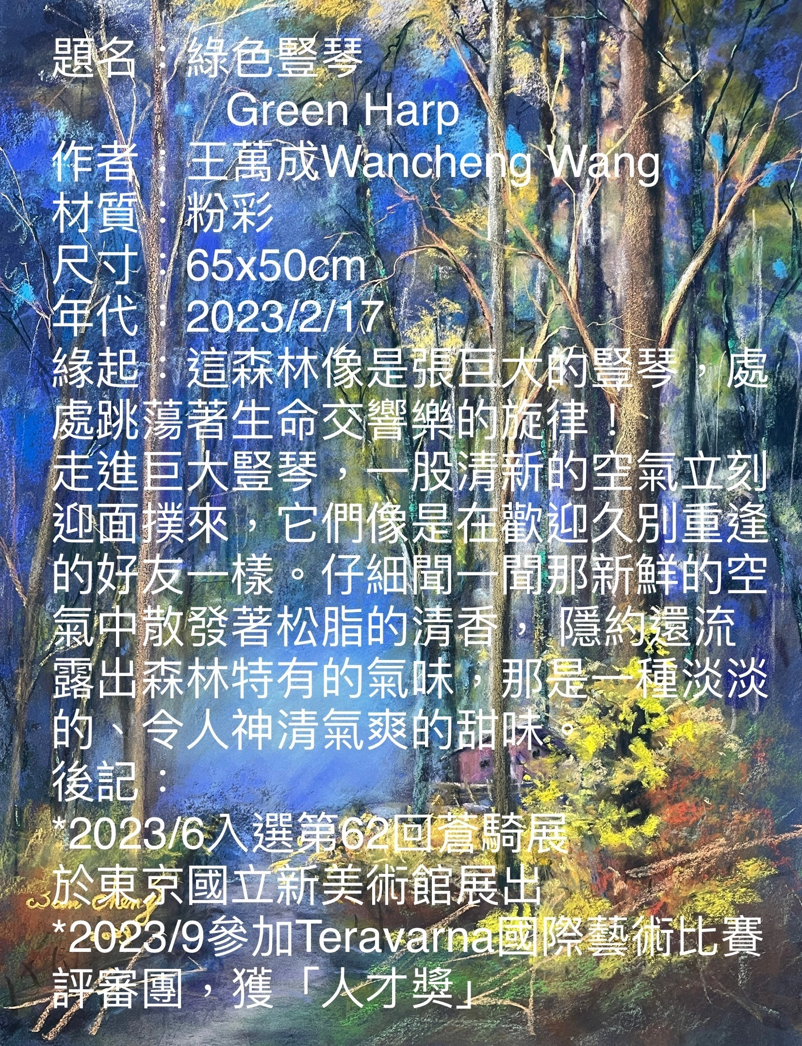 本作品參加 2023入選第62回蒼騎展,東京國立新美術館展出。2023TERAVARNA國際藝術比賽,獲「人才獎」。