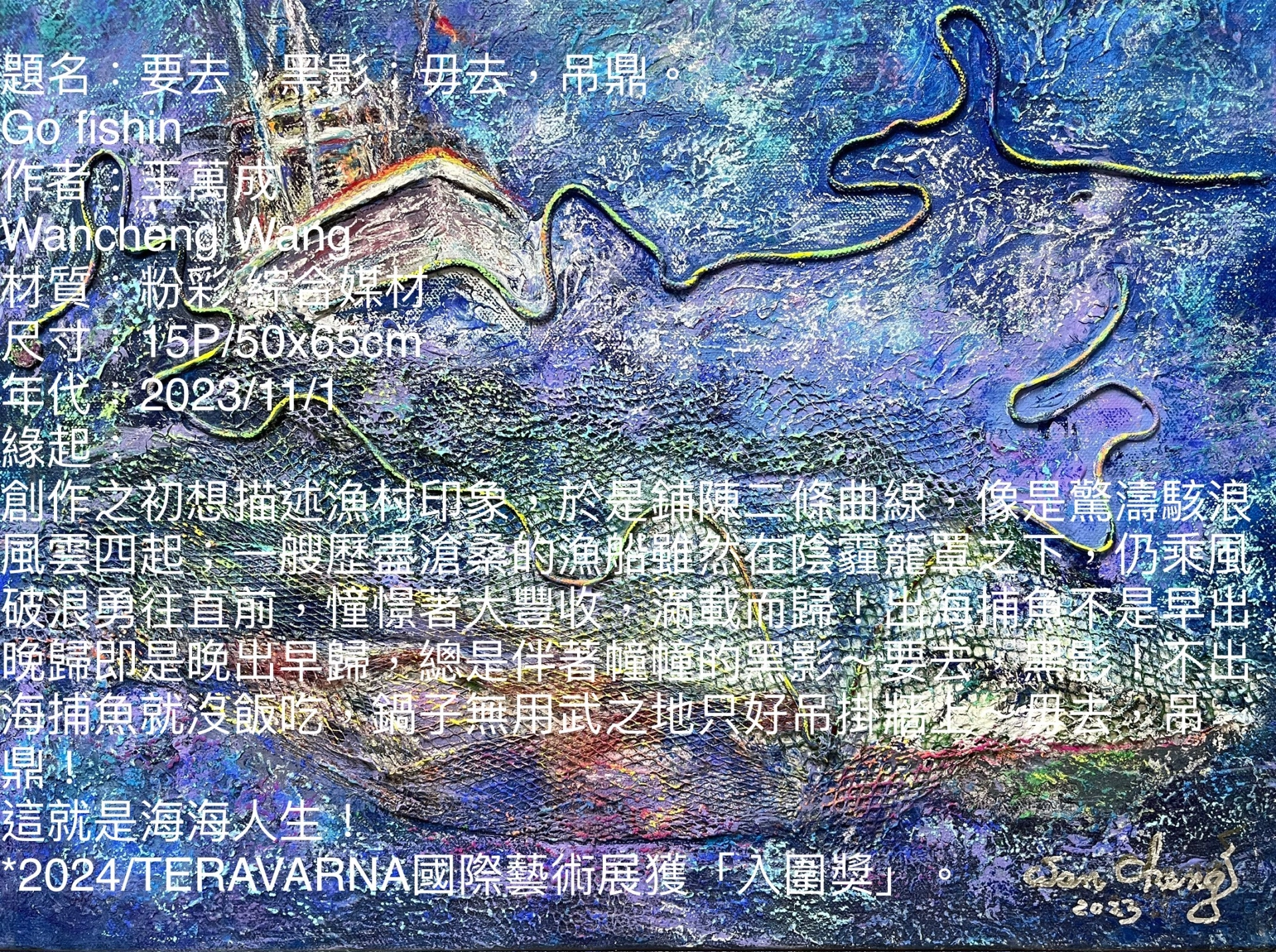 畫作描述歷盡滄桑的漁船,陰霾中乘風破浪勇往直前!這就是海海人生。要去,黑影!毋去,吊鼎!