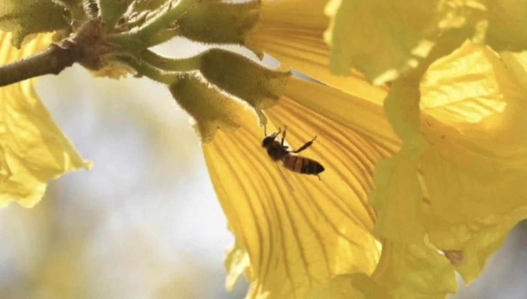蜜蜂在花朵上剛著陸,看似被花朵擁抱而非辛苦勞作,替牠感到幸福。