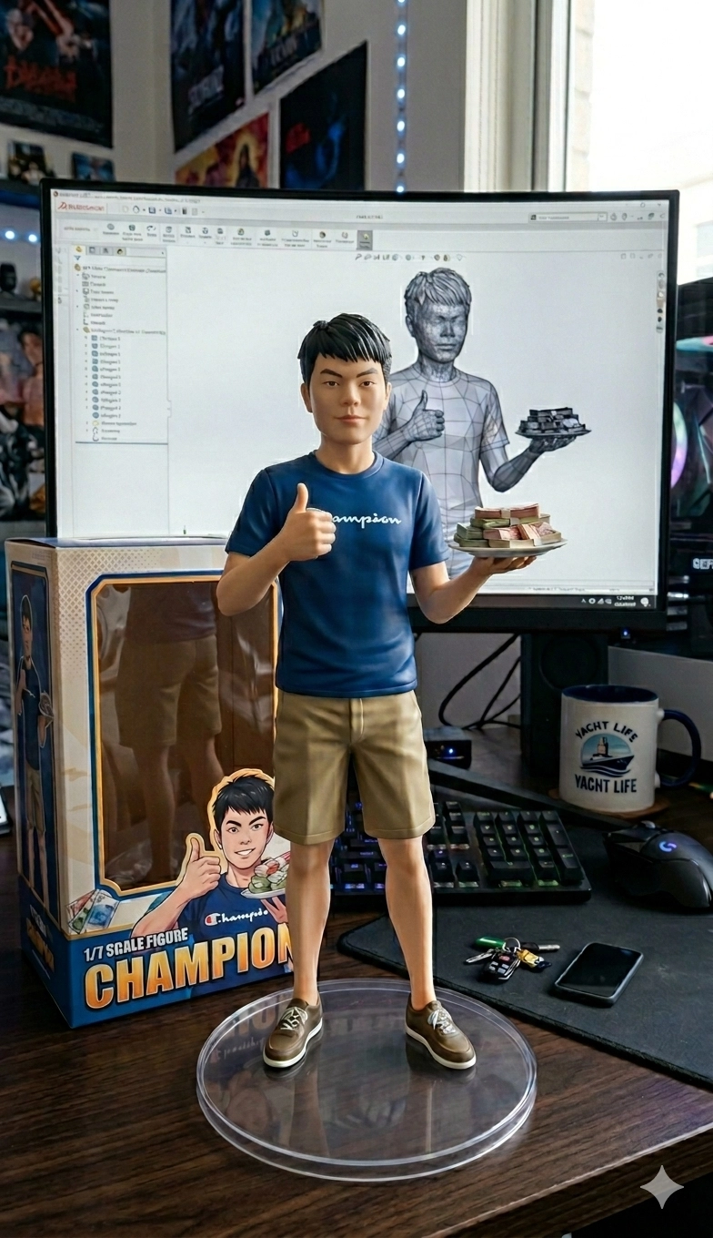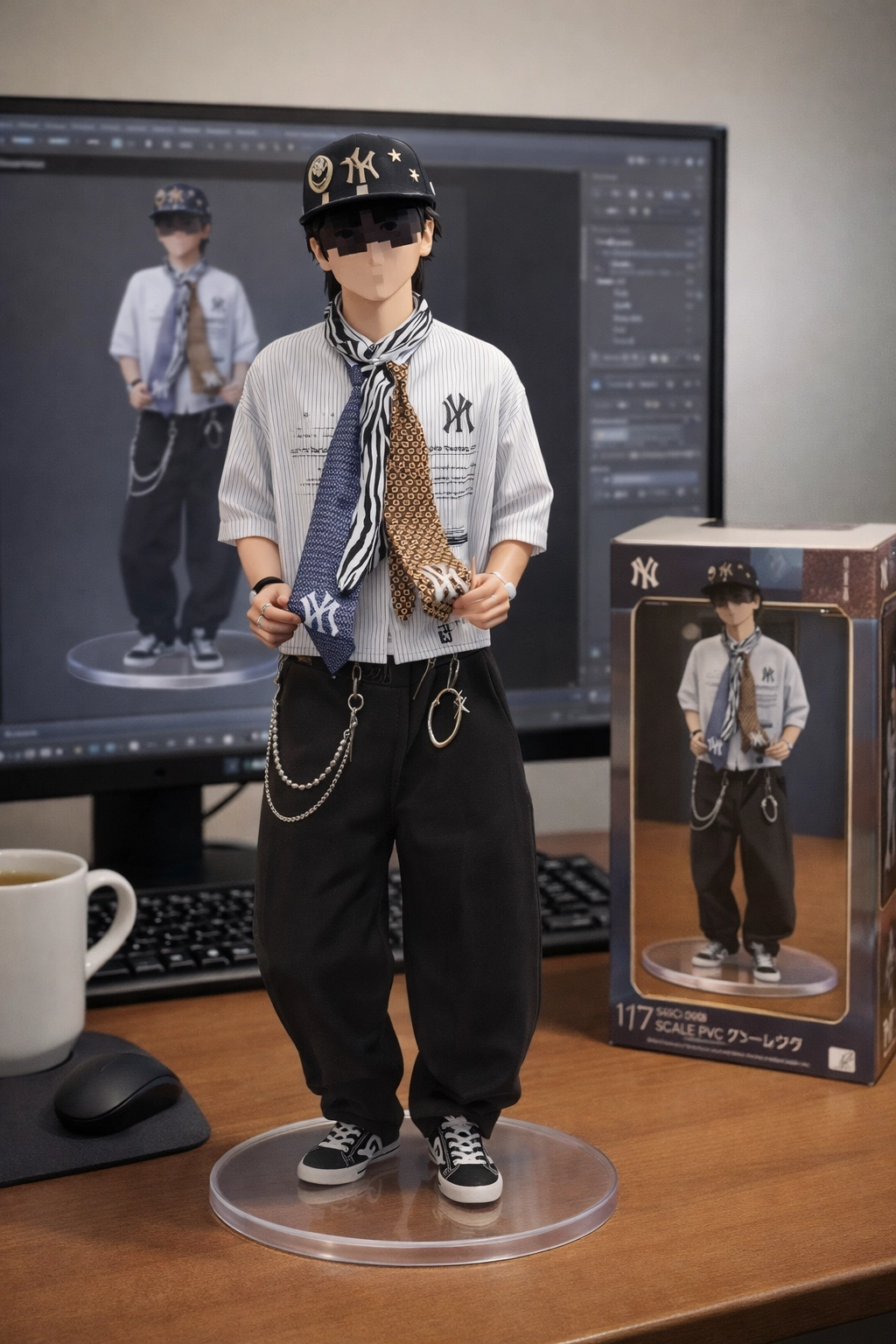 請用我提供的原圖,把圖片內主體變成電腦桌前的立體公仔。場景為一張電腦書桌,上面擺放著一個1/7比例的