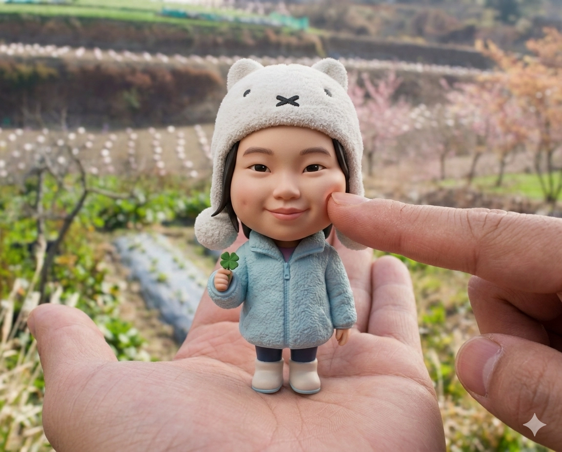 看附圖。製作一張高品質、比例5:4的微距照片,採用45度俯側拍視角。畫面中心是一個精緻的微型Q版潮玩