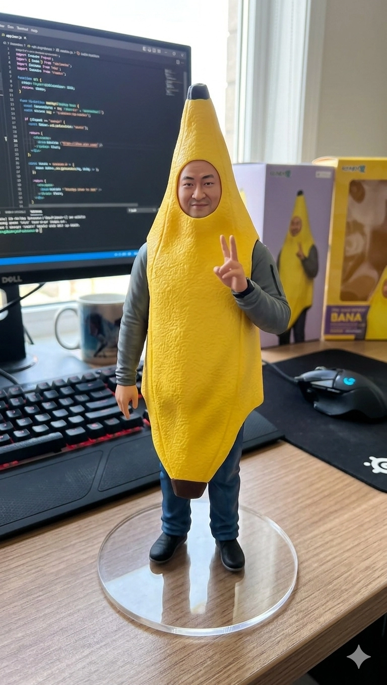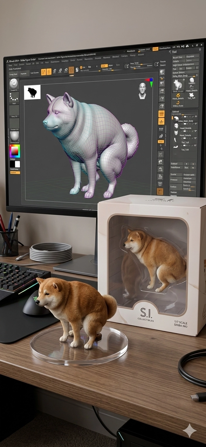 請用我提供的原圖,把圖片內主體變成電腦桌前的立體公仔。場景為一張電腦書桌,上面擺放著一個1/7比例的