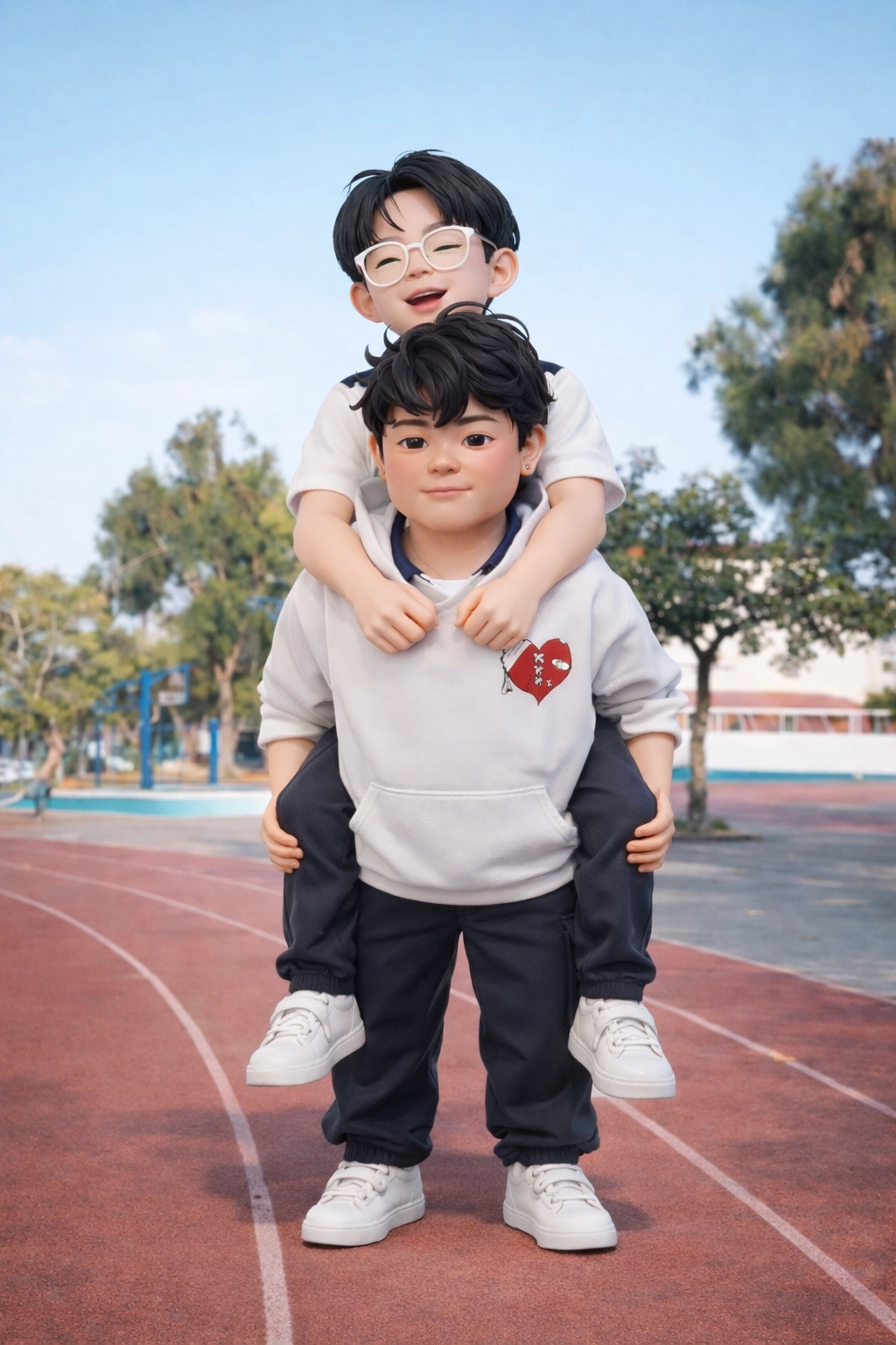 背景維持學校下面的人用手扶著上面人的腳(像背人的姿勢保持公仔模型風格)