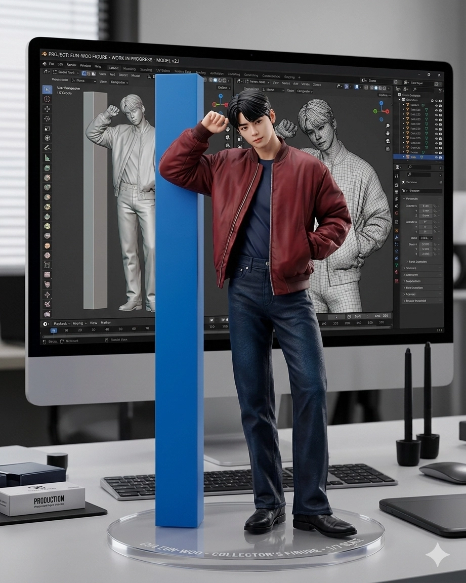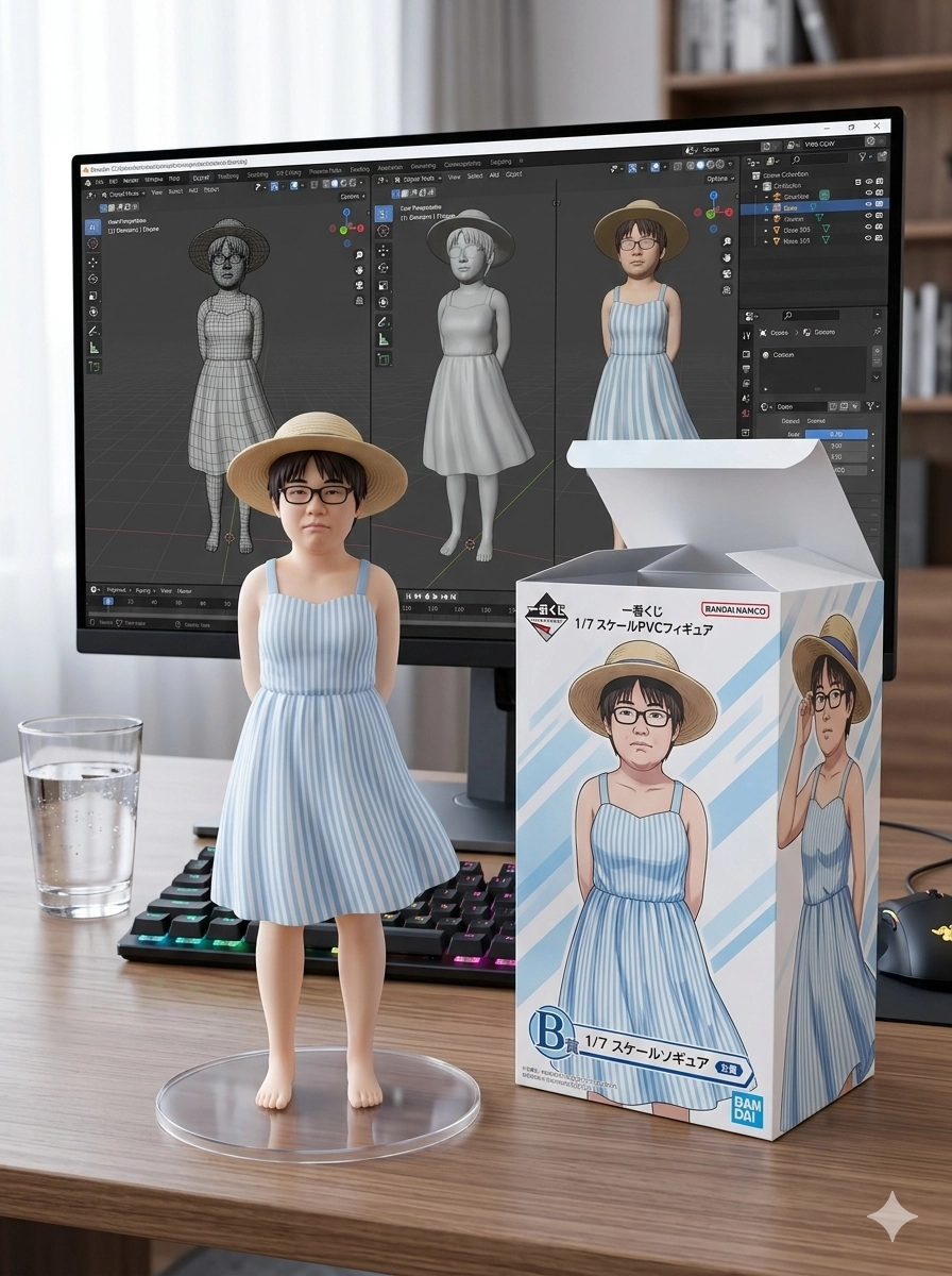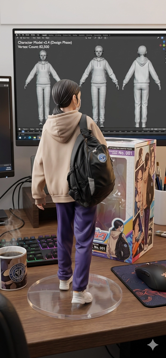 請用我提供的原圖,把圖片內主體變成電腦桌前的立體公仔。場景為一張電腦書桌,上面擺放著一個1/7比例的