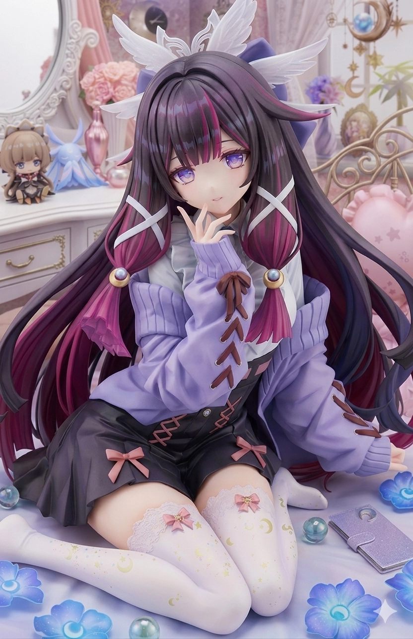 場景為一張電腦書桌,上面擺放著一個1/7比例的PVC公仔,角色以站立姿態呈現,並固定在透明圓形底座上