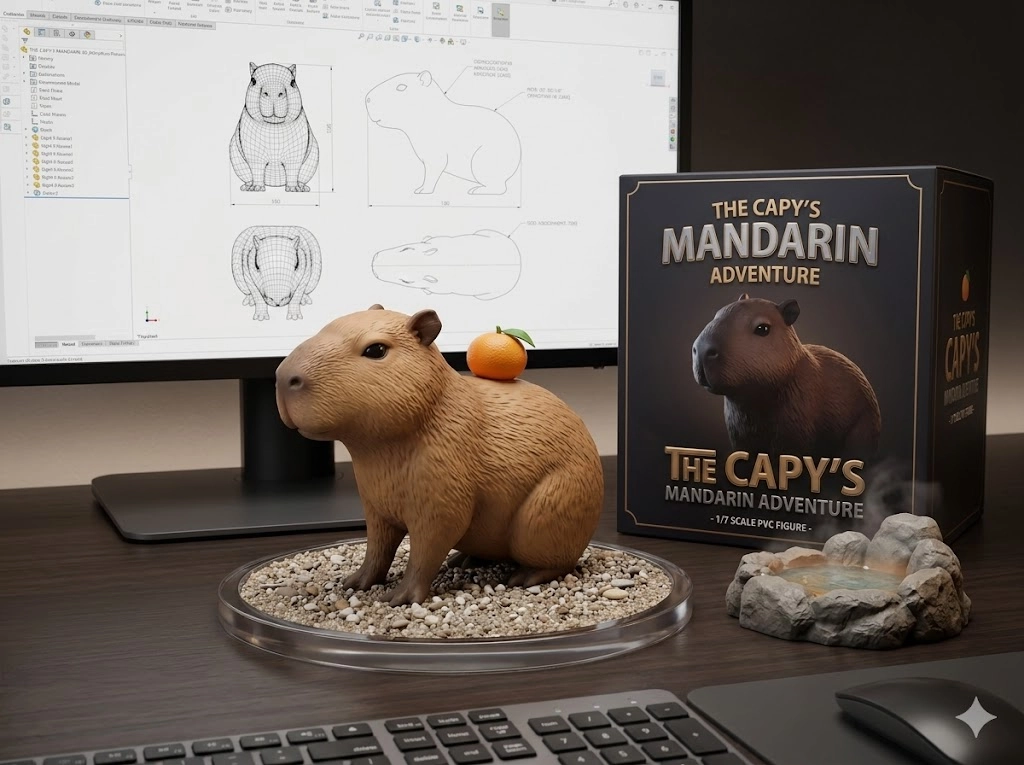 請用我提供的原圖,把圖片內主體變成電腦桌前的立體公仔。場景為一張電腦書桌,上面擺放著一個1/7比例的