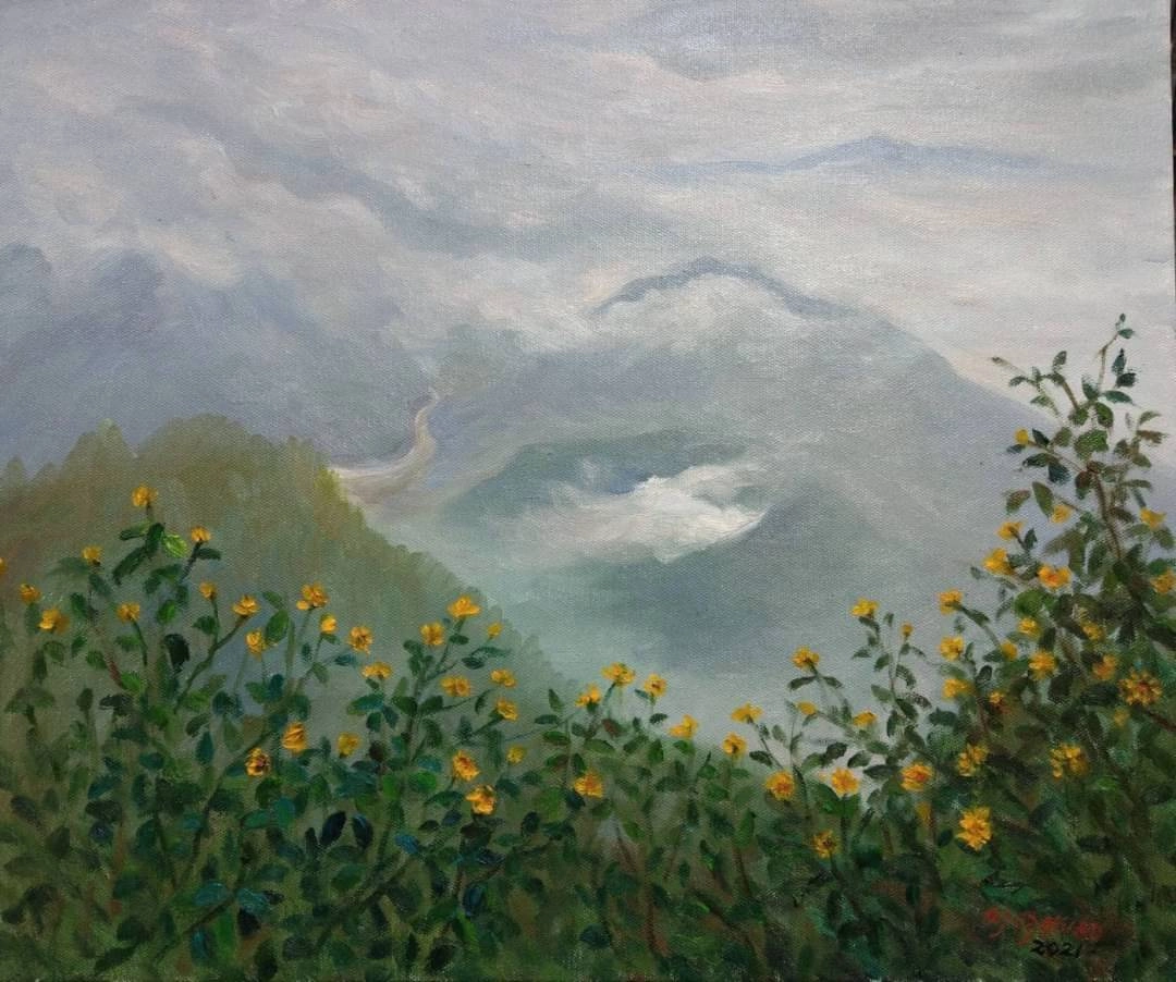 這幅畫作描繪了一個充滿夢幻色彩的自然景觀。前景中盛開的黃色花朵生機勃勃,與背景的山脈和雲霧形成鮮明對