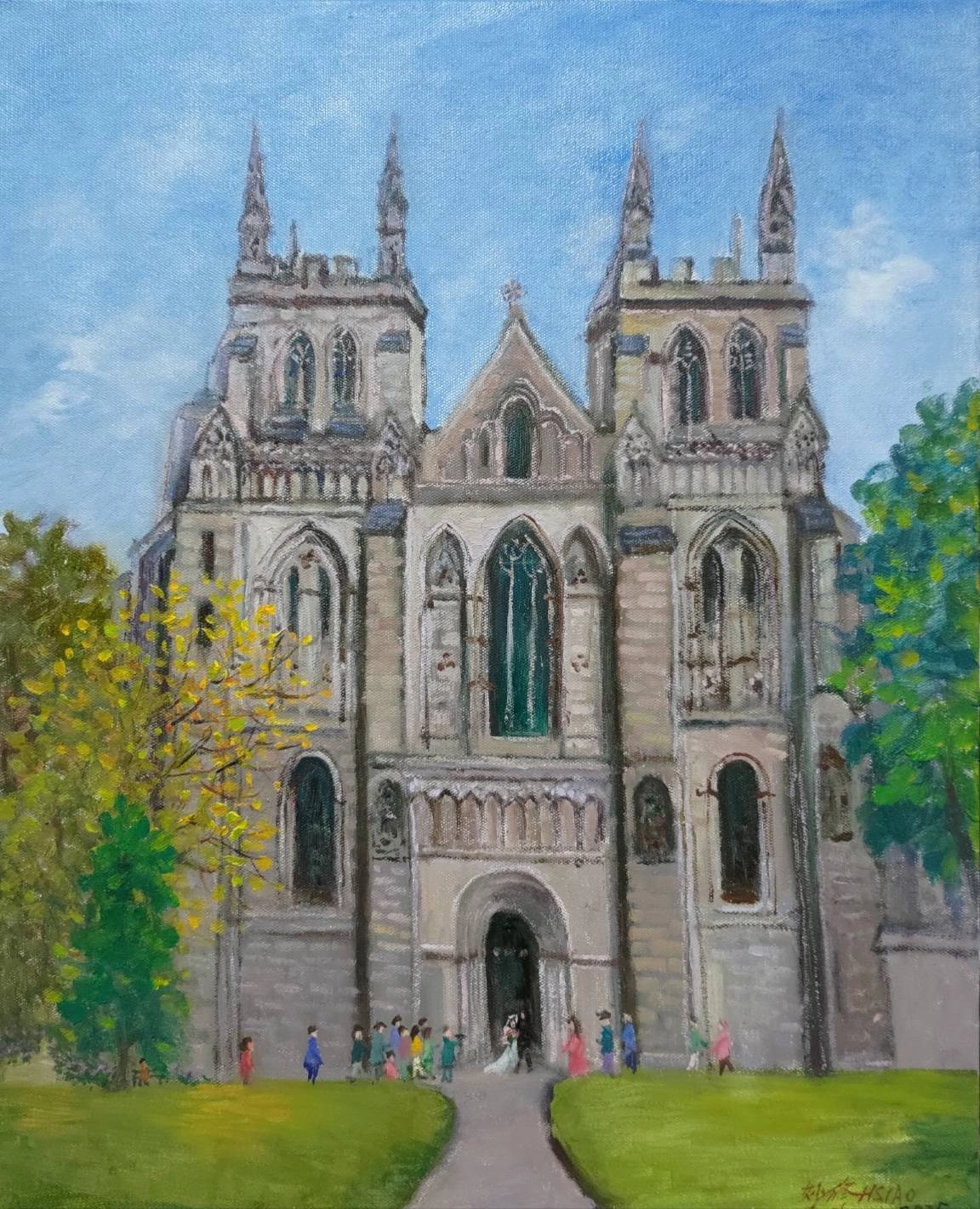 這幅畫作描繪了一座宏偉的教堂,其建築風格顯示出精緻的哥德式特色,尖頂和拱形窗戶都透露出歷史的厚重感。