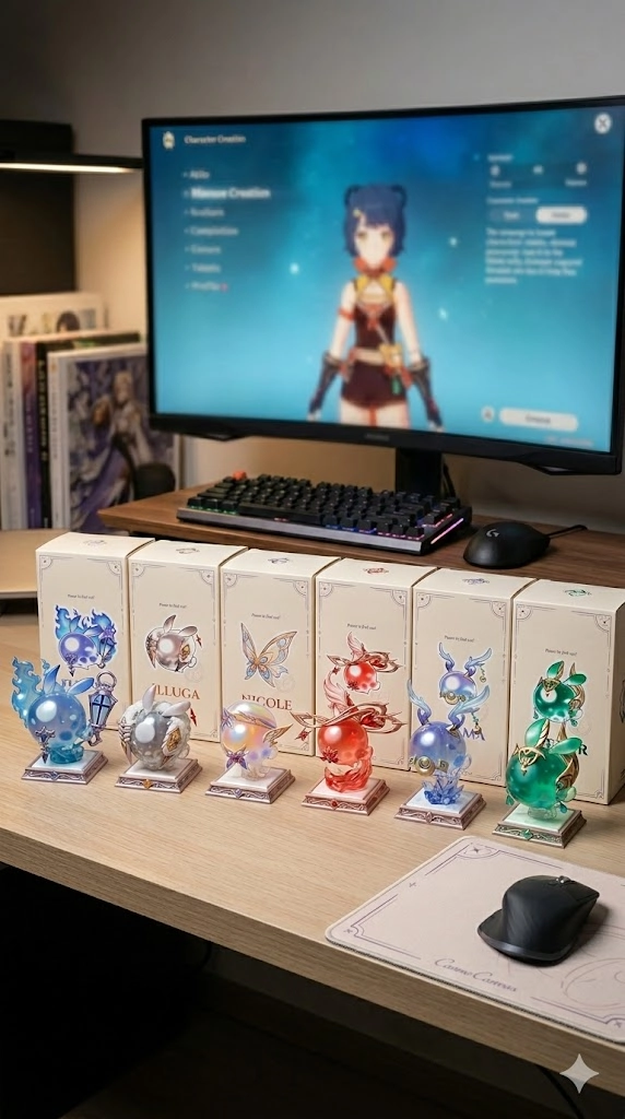 請根據我提供的六張原圖,把各張圖片內的主體變成電腦桌前的盲盒立體公仔。場景為一張電腦書桌,上面擺放著