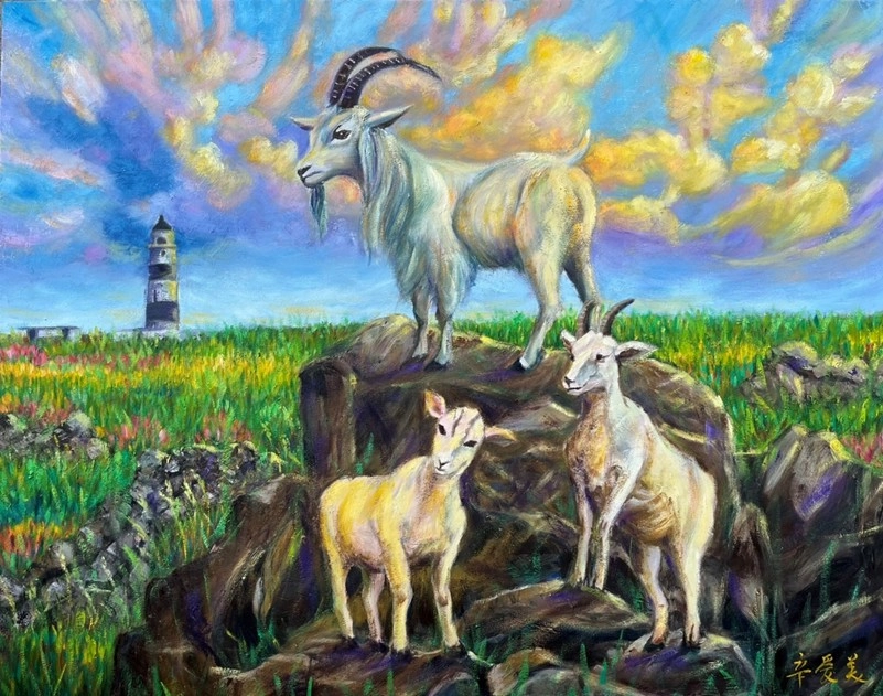 題目:風光無限規格:30F(91.0×72.5cm)媒材:油畫創作年代:2025作品說明:山羊佇立於