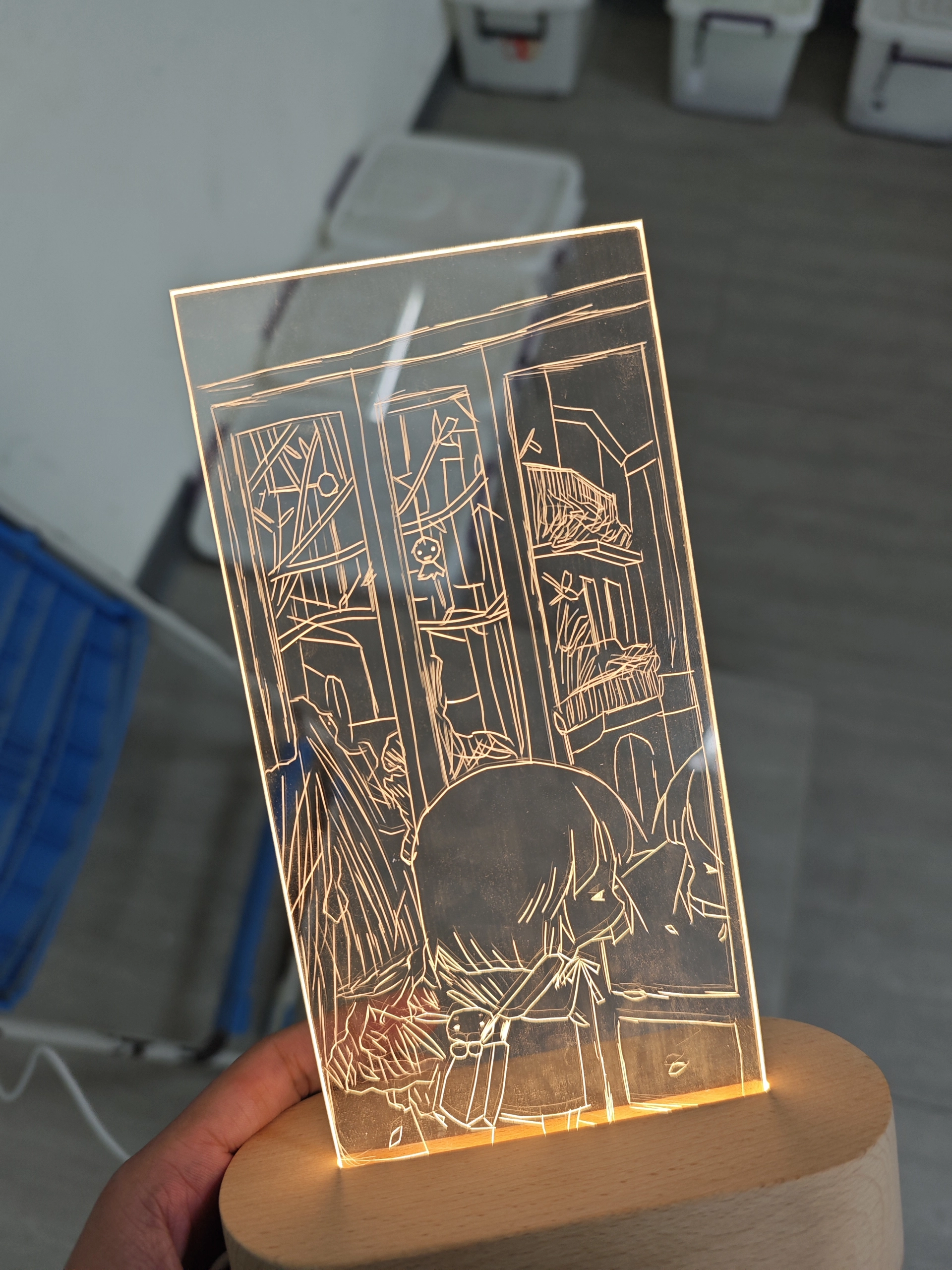 這件壓克力燈飾以手繪線條刻畫出溫馨的場景:一位小女孩在窗前凝望,周圍細節以簡潔的線描呈現,透過光線投