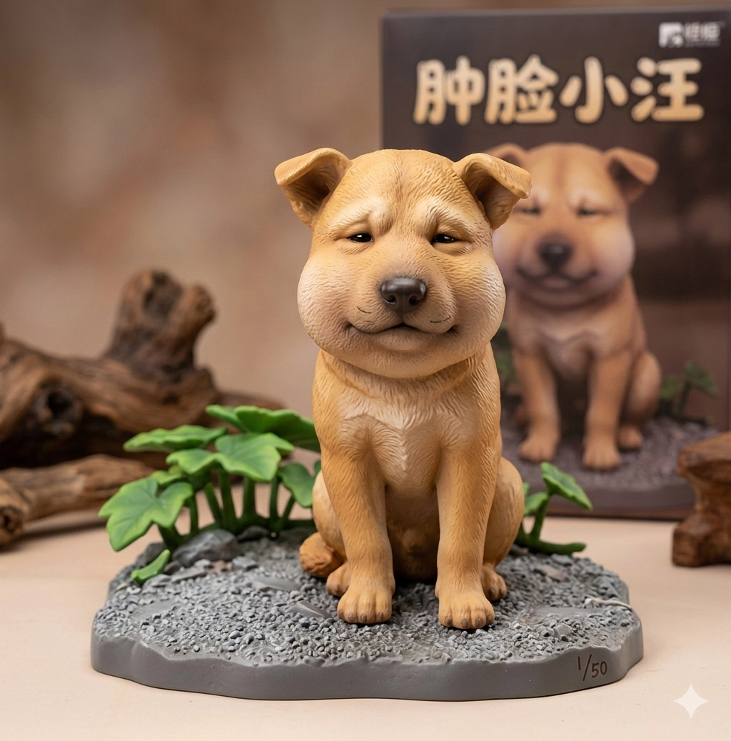 請用我提供的原圖,把圖片內主體變成電腦桌前的立體公仔。場景為一張電腦書桌,上面擺放著一個1/7比例的