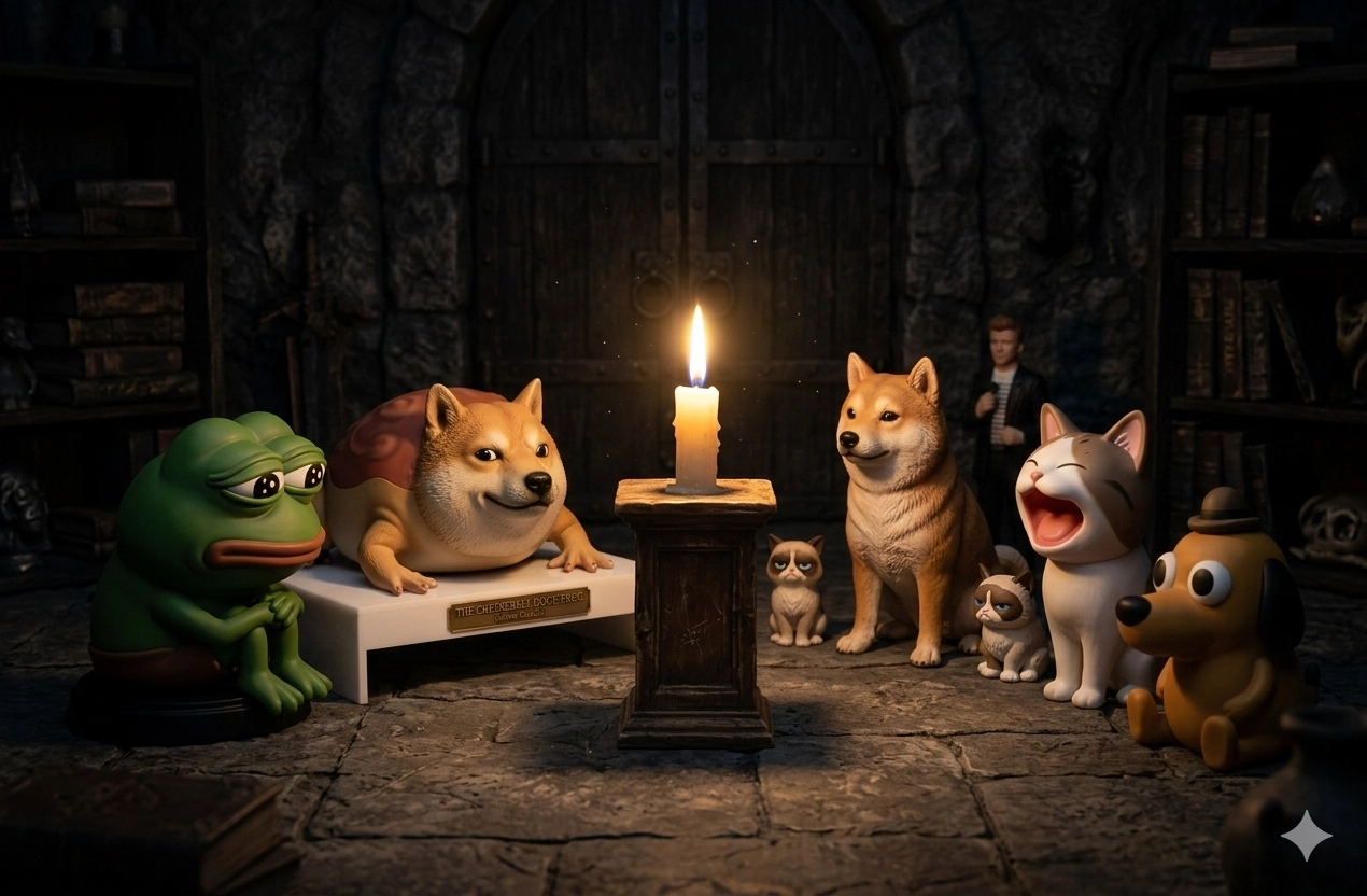 生成公仔在黑色房間內與其他meme(像是pepe,doge,popcat等)的秘密聚會,他們圍成一圈