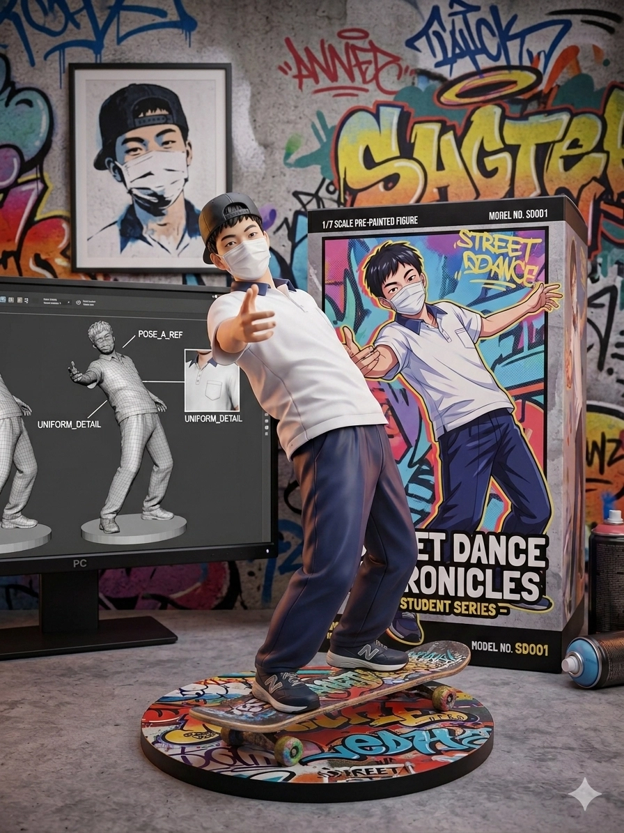 請用我提供的原圖,把圖片內主體變成街頭塗鴉牆面前的立體公仔。場景為街頭塗鴉牆面前,上面擺放著一個1/