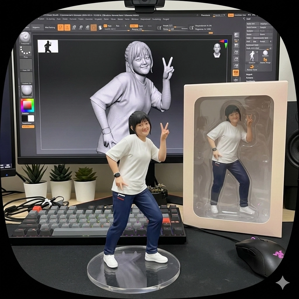 請用我提供的原圖,把圖片內主體變成電腦桌前的立體公仔。場景為一張電腦書桌,上面擺放著一個1/7比例的