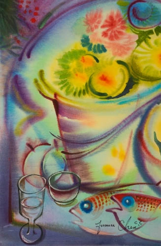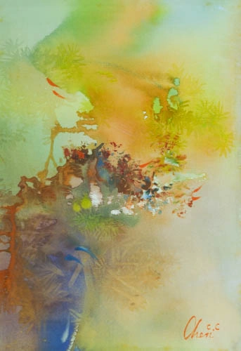 本幅水彩作品主題內容是我所設計設置在澎湖的公共藝術作品,作品由上而下依時間序為:90年「夏日風情」(