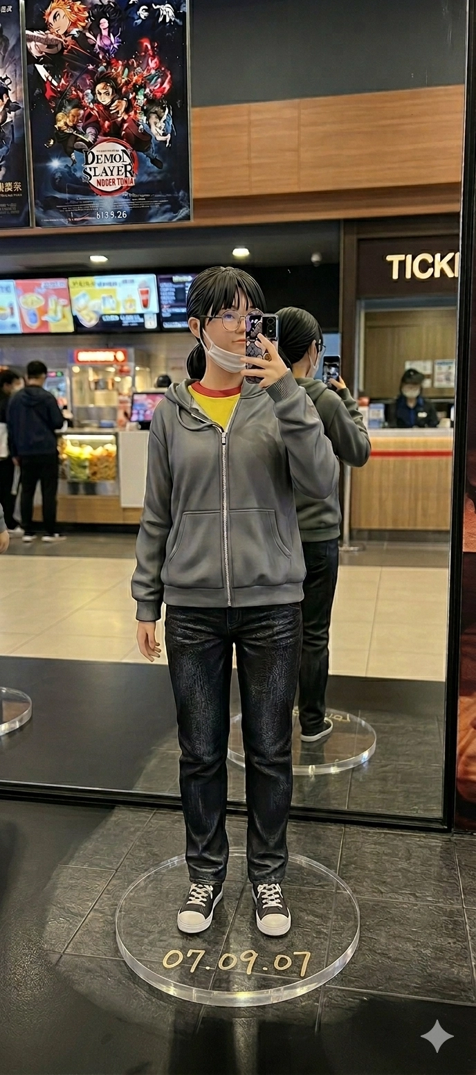 幫我用這張圖做一個立體人物模型,背景在電影院,人物像在對一面鏡子拍照,下半身穿牛仔褲,並且讓它站在一