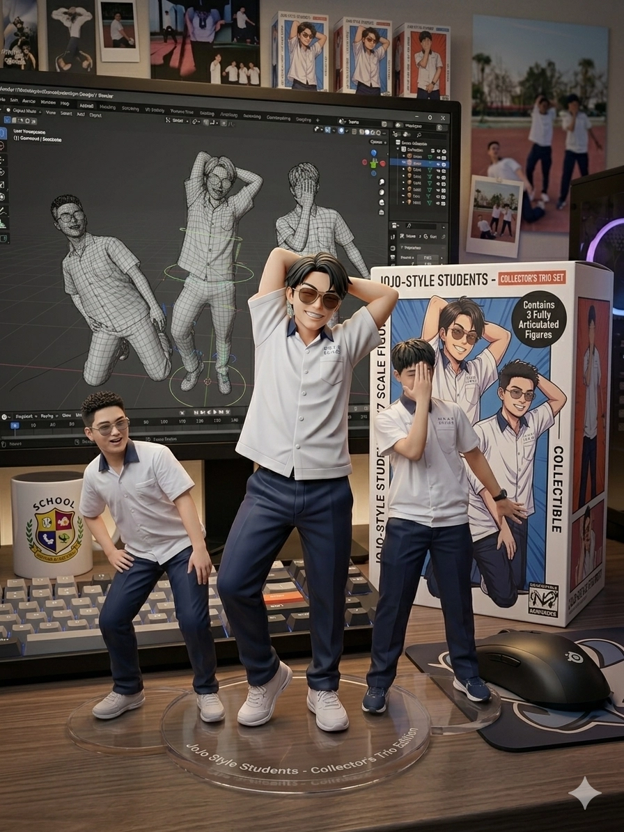 請幫我依照這張照片中的人做成一個3D立體公仔,一隻腳要往旁邊勾起來,另一隻站立,手的姿勢隨意,背景要
