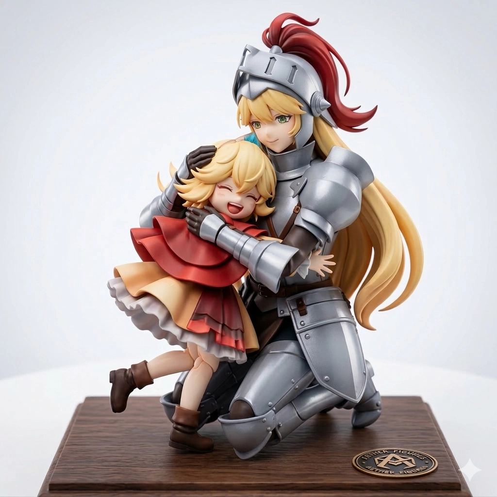 將這張照片的兩個人變成約16:1的公仔,高的女性騎士為跪座的姿勢,小女孩是抱住騎士的樣子