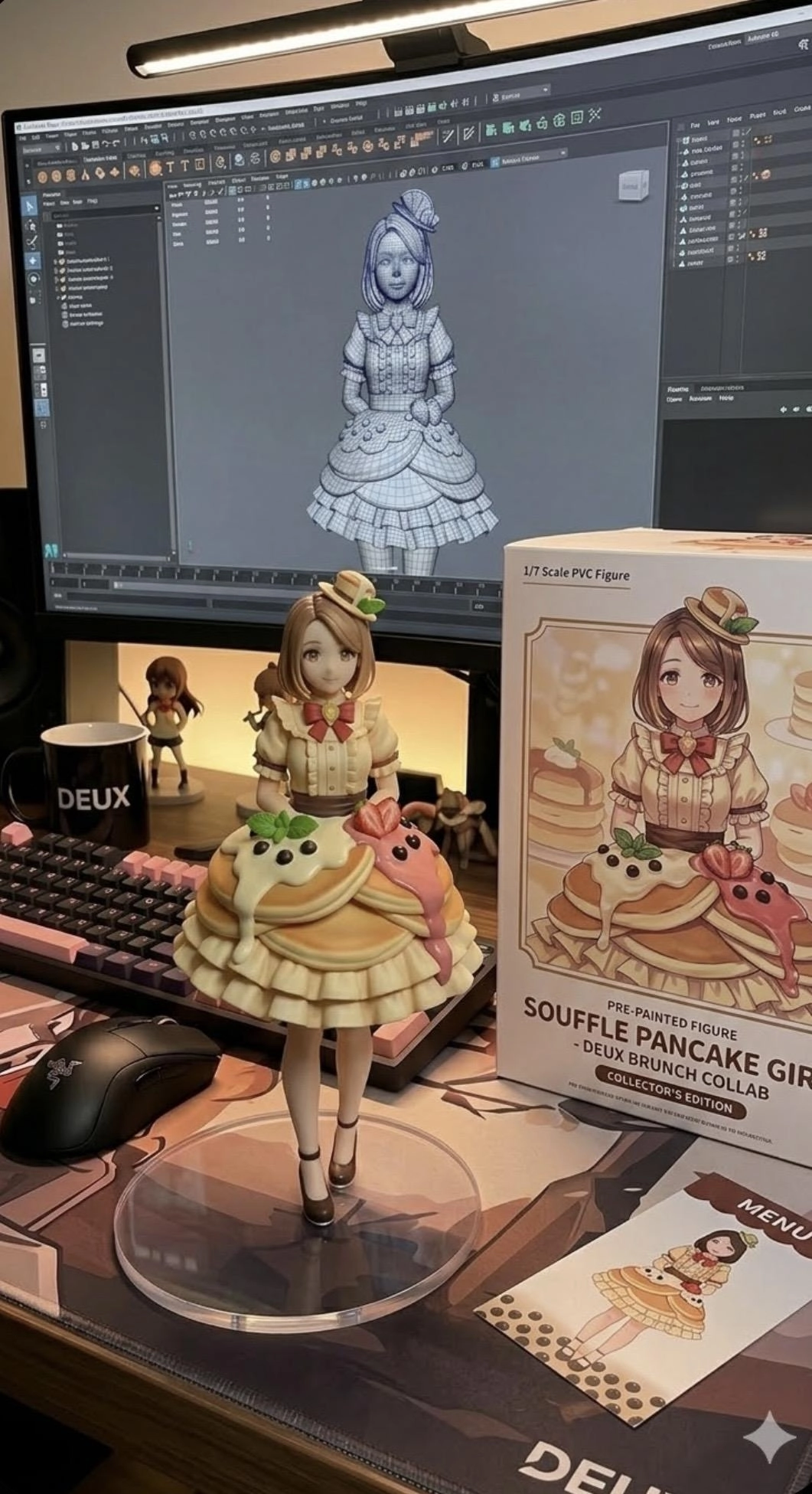 請用我提供的原圖,把圖片內主體變成電腦桌前的立體公仔。場景為一張電腦書桌,上面擺放著一個1/7比例的