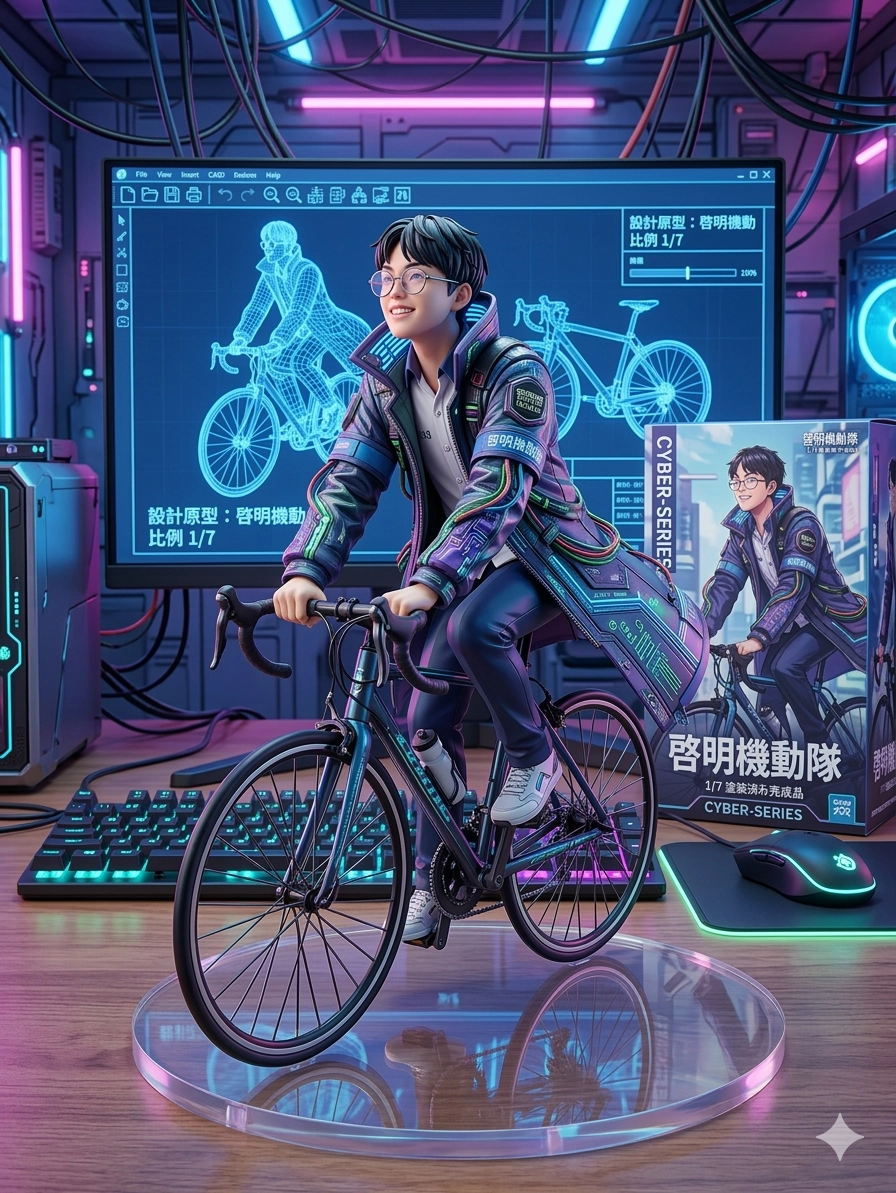 輸入「請用我提供的原圖,把圖片內主體變成電腦桌前的立體公仔。場景為一張電腦書桌,上面擺放著一個1/7