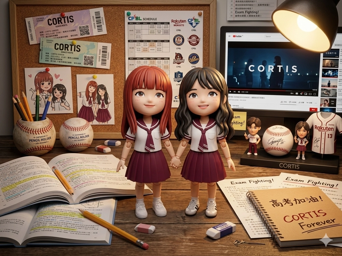 幫我用這張圖生成公仔並且背景在一個溫馨的高三考生的書桌上這個高三考生喜歡棒球以及韓團cortis他還