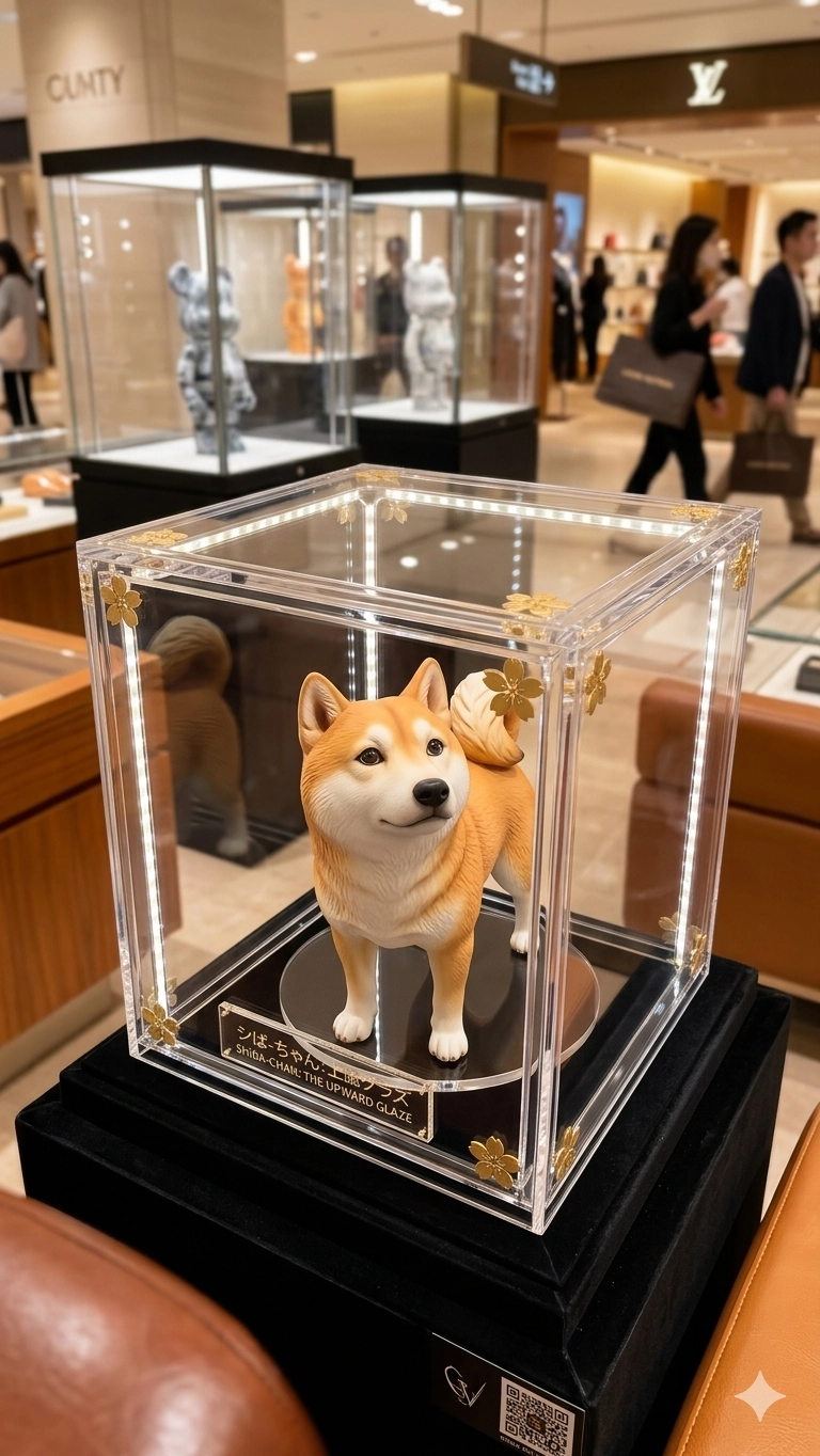 請把張圖中的狗變成公仔,並且裝在精緻的透明展示盒中,背景是百貨公司正在展示它