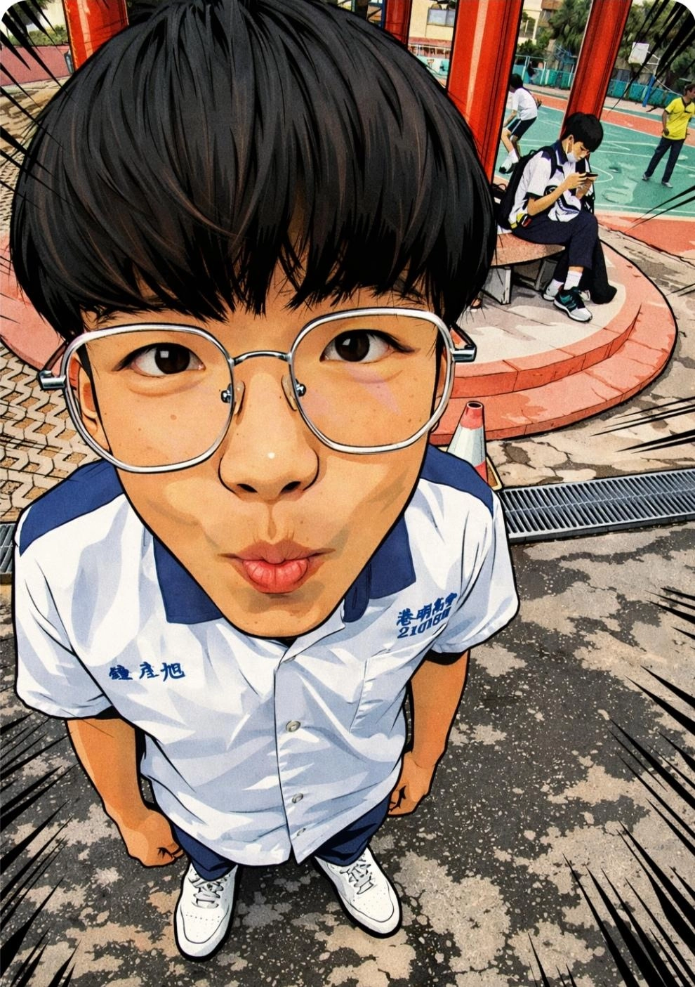 請幫我將這張圖二次元化,將人物的臉稍微還原,再漫畫化。