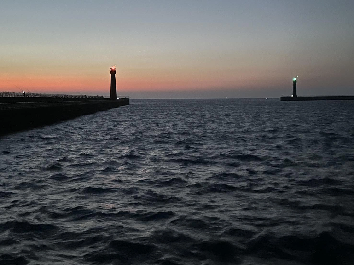 港口左紅右綠的兩盞燈在夕陽餘暉中早已亮起,為進出港的船隻指引方向,無聲守護著漁民的安全。