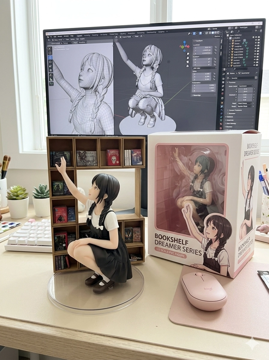優點:這不只是一張公仔圖,而是一個「從無到有」的設計現場。背景的3D建模、桌上的設定集與配件,完美交