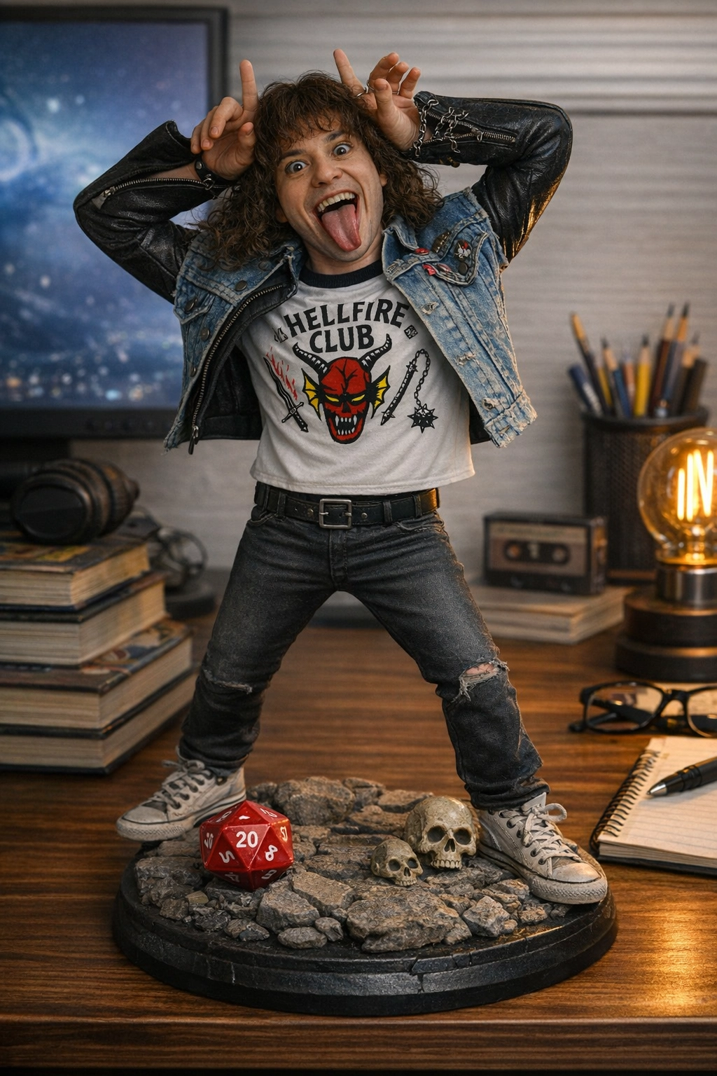 請用我提供的原圖,把圖片內主體變成電腦桌前的立體公仔。場景為一張電腦書桌,上面擺放著一個1/7比例的