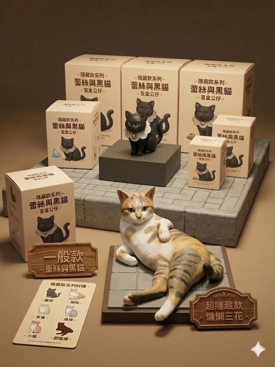 可以幫我用這張貓咪圖做成公仔嗎Q版不要太寫實,讓這張圖的貓咪當隱藏款,讓剛剛那隻黑貓當盲盒封面,然後