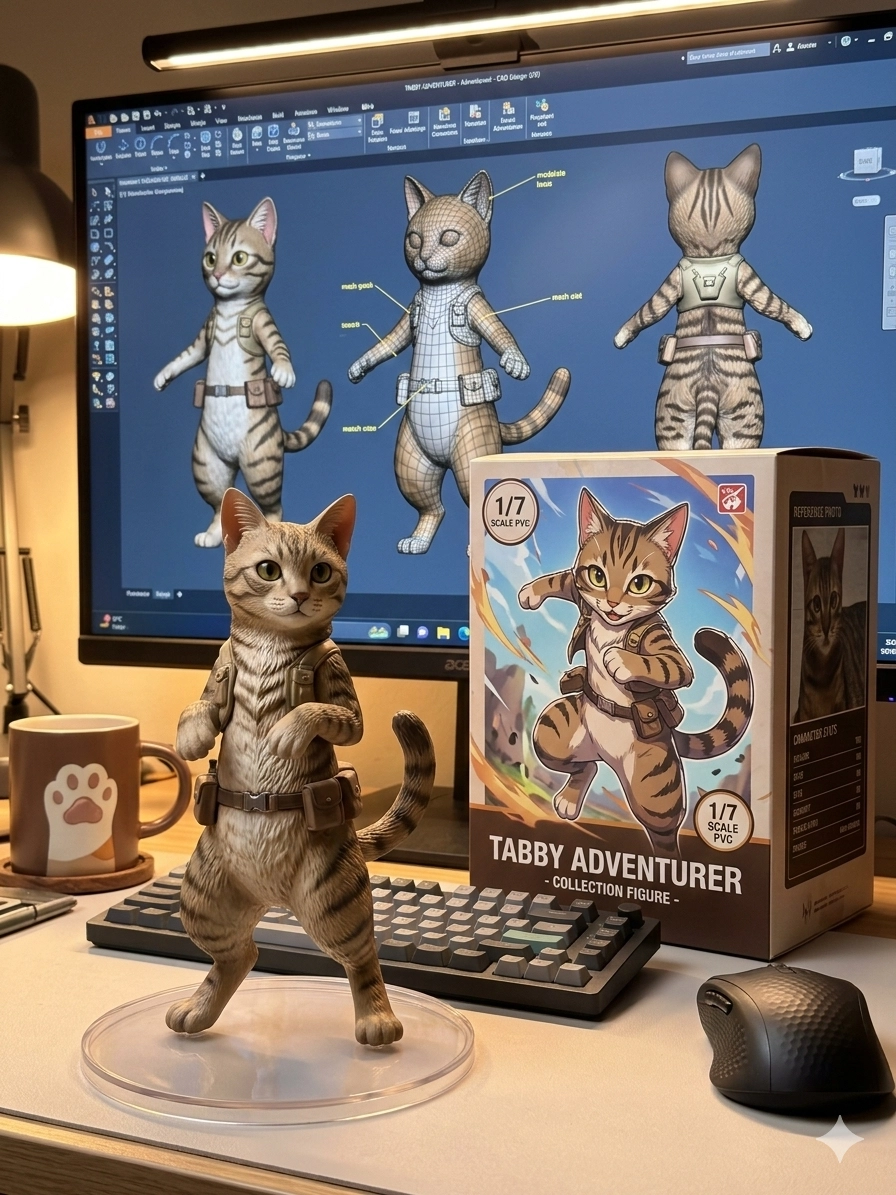 這件作品將一張平凡的街角賓士貓照片,轉化為具備「後設敘事」感的神級動漫周邊收藏場景