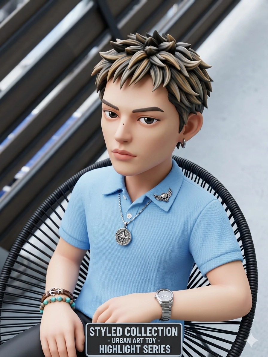 幫我生成公仔圖像讓他換一身淺藍色polo衫頭髮顏色變成美式挑染加上一些配飾