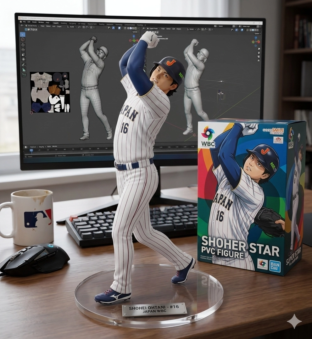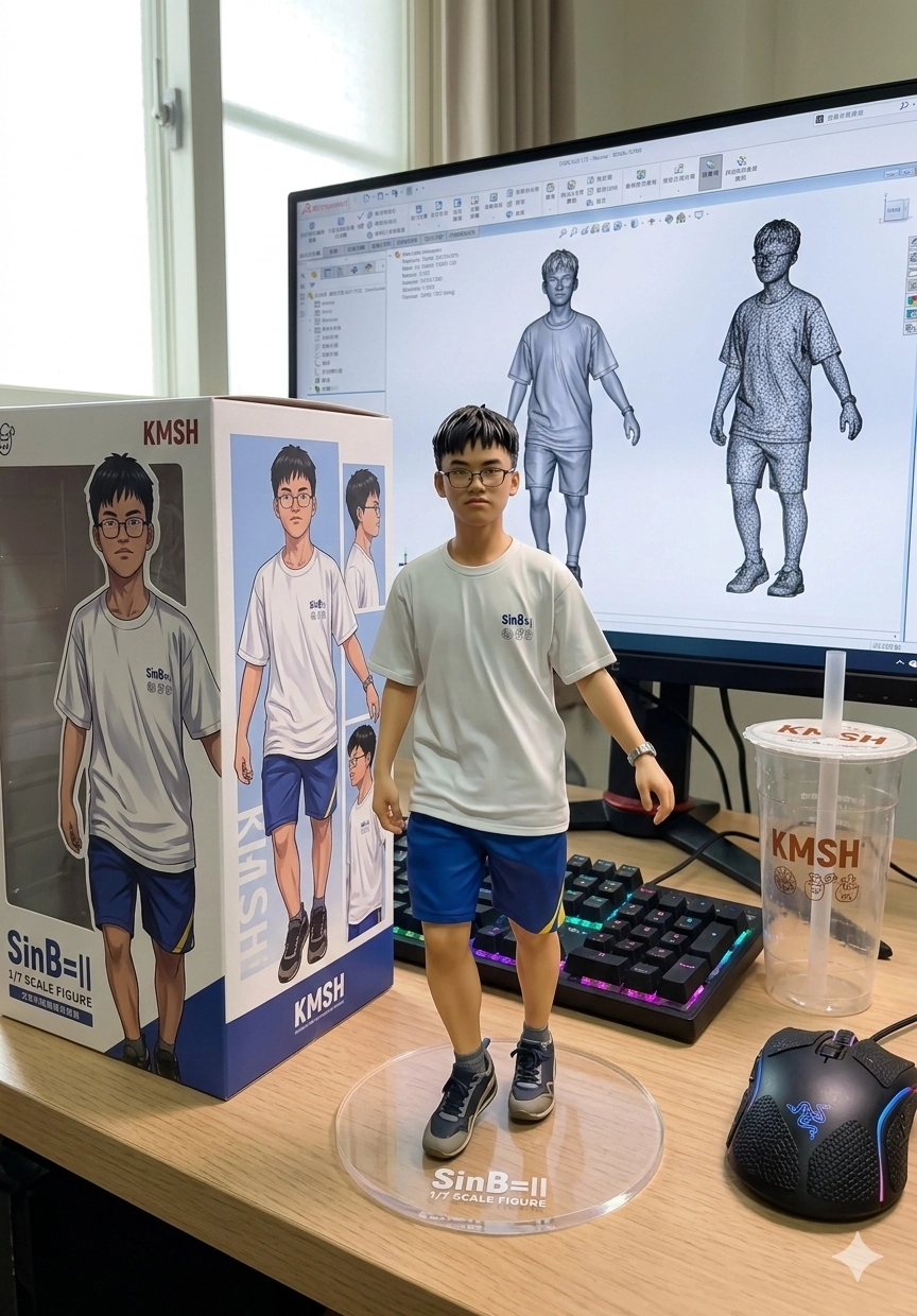 請用我提供的原圖,把圖片內主體變成電腦桌前的立體公仔。場景為一張電腦書桌,上面擺放著一個1/7比例的