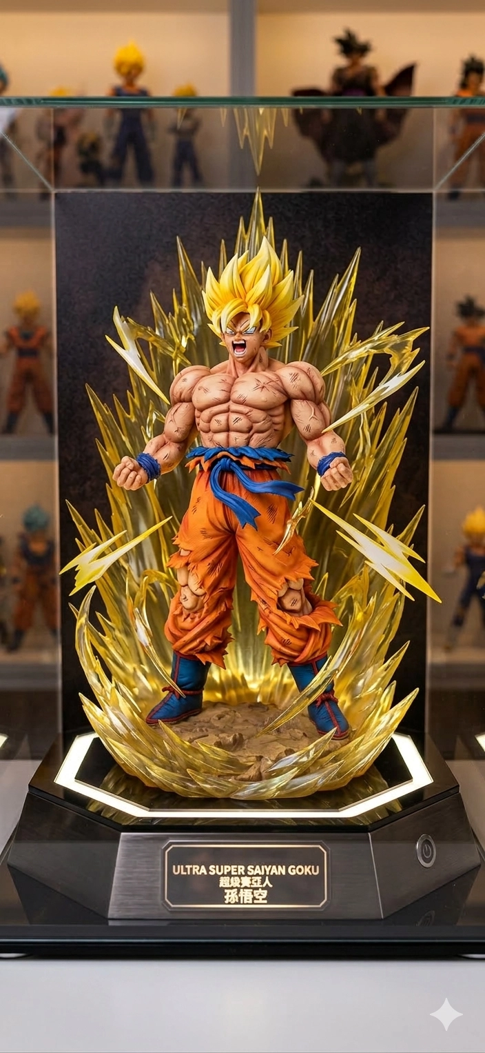 用此圖片生成出一個公仔,公仔要立在一個帶有照光的展示架上