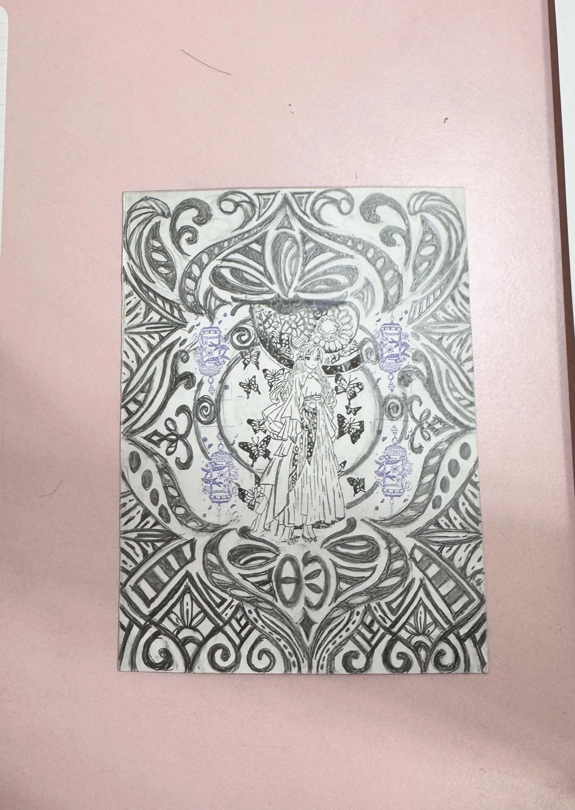 港明國一生骷顱頭代表著死亡毛毛蟲,花和蝸牛代表著新的生命以色鉛筆為主
