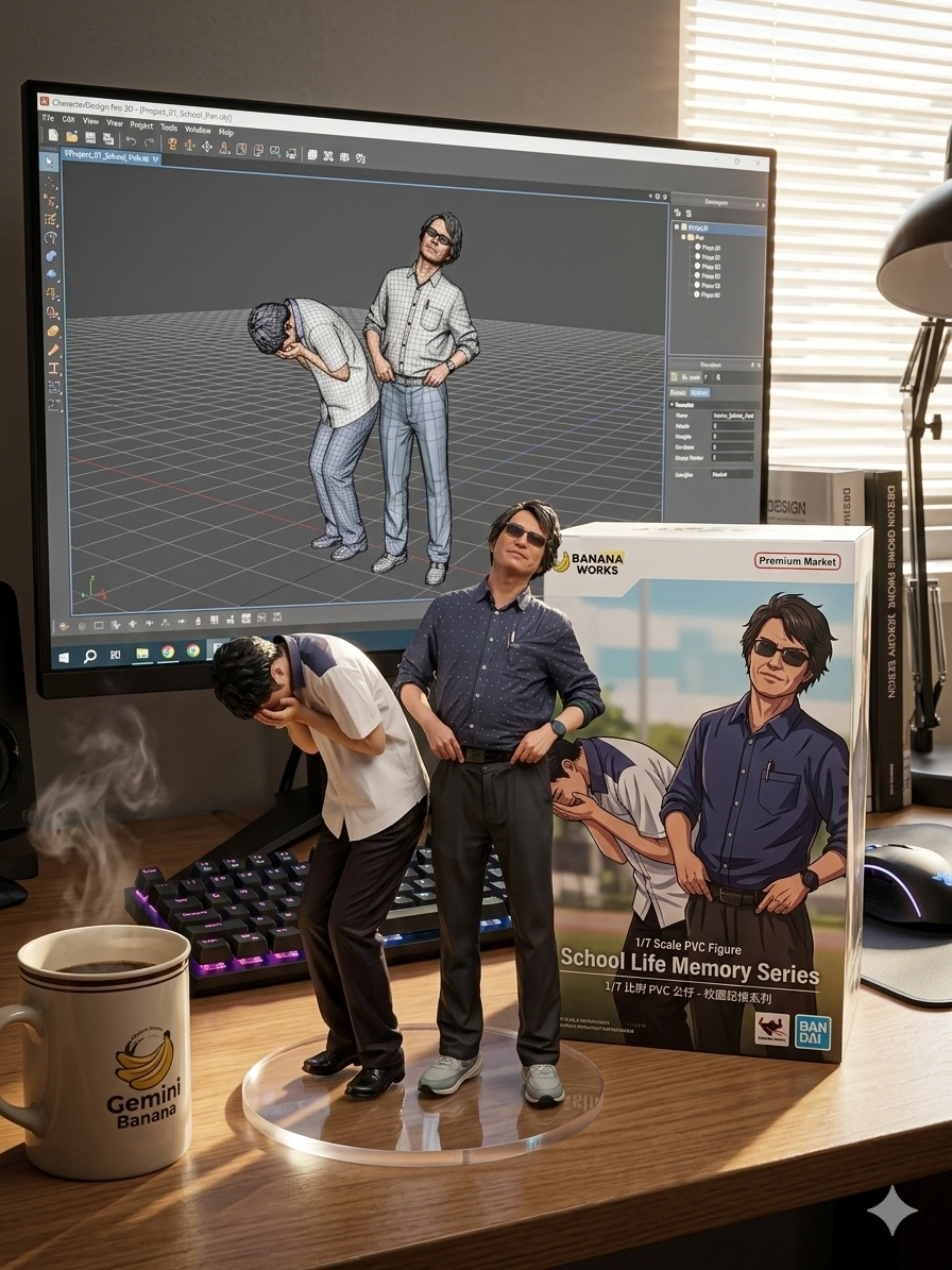使用Gemini製作指令:請用我提供的原圖,把圖片內主體變成電腦桌前的立體公仔。場景為一張電腦書桌,