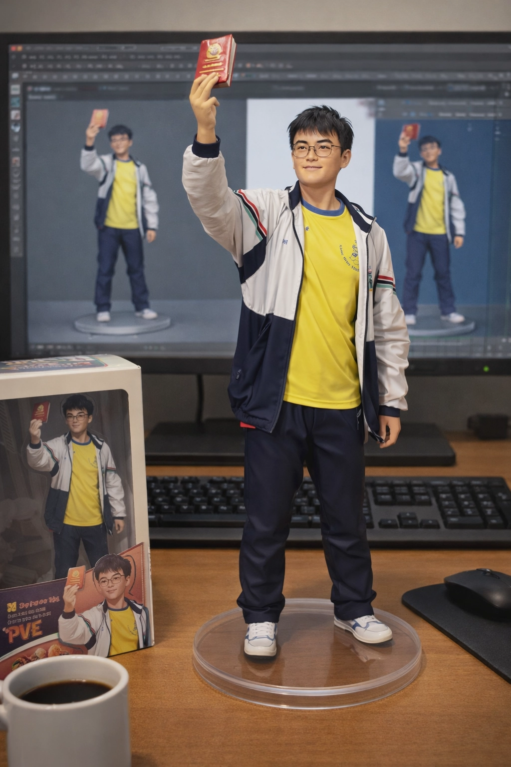 請用我提供的原圖,把圖片內主體變成電腦桌前的立體公仔。場景為一張電腦書桌,上面擺放著一個1/7比例的