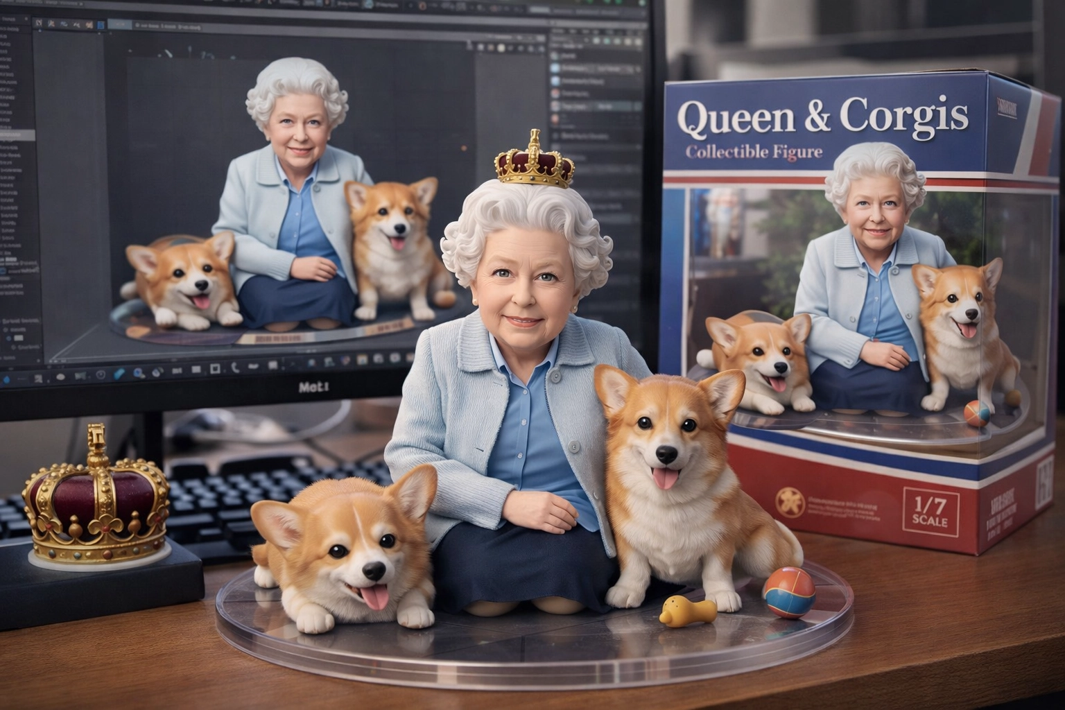 請用我提供的原圖,把圖片內主體變成電腦桌前的立體公仔。場景為一張電腦書桌,上面擺放著兩個1/7比例的