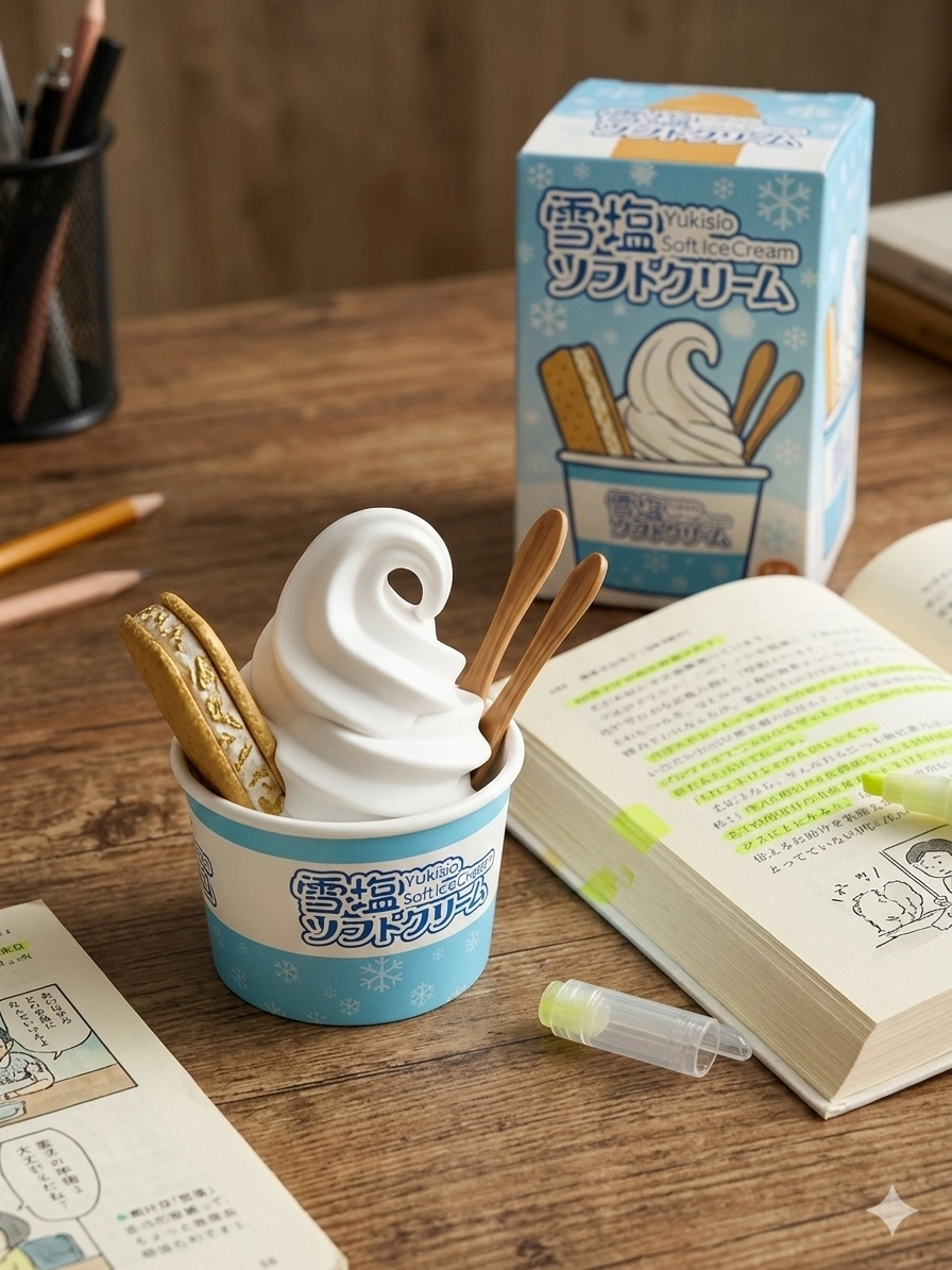 請將圖片中的冰淇淋做成一個公仔場景為書桌,桌上有一本打開的書,書上有用螢光筆畫過的痕跡冰淇淋公仔放在