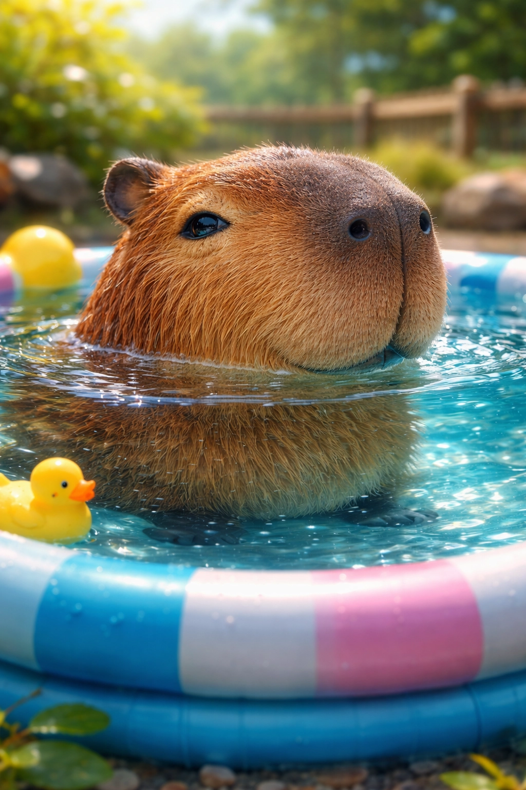 直式圖的指令:請幫我生成一張風格化水豚玩具公仔的巨集照片,在迷你泳池中游泳。水豚的臉部表情非常冷靜且