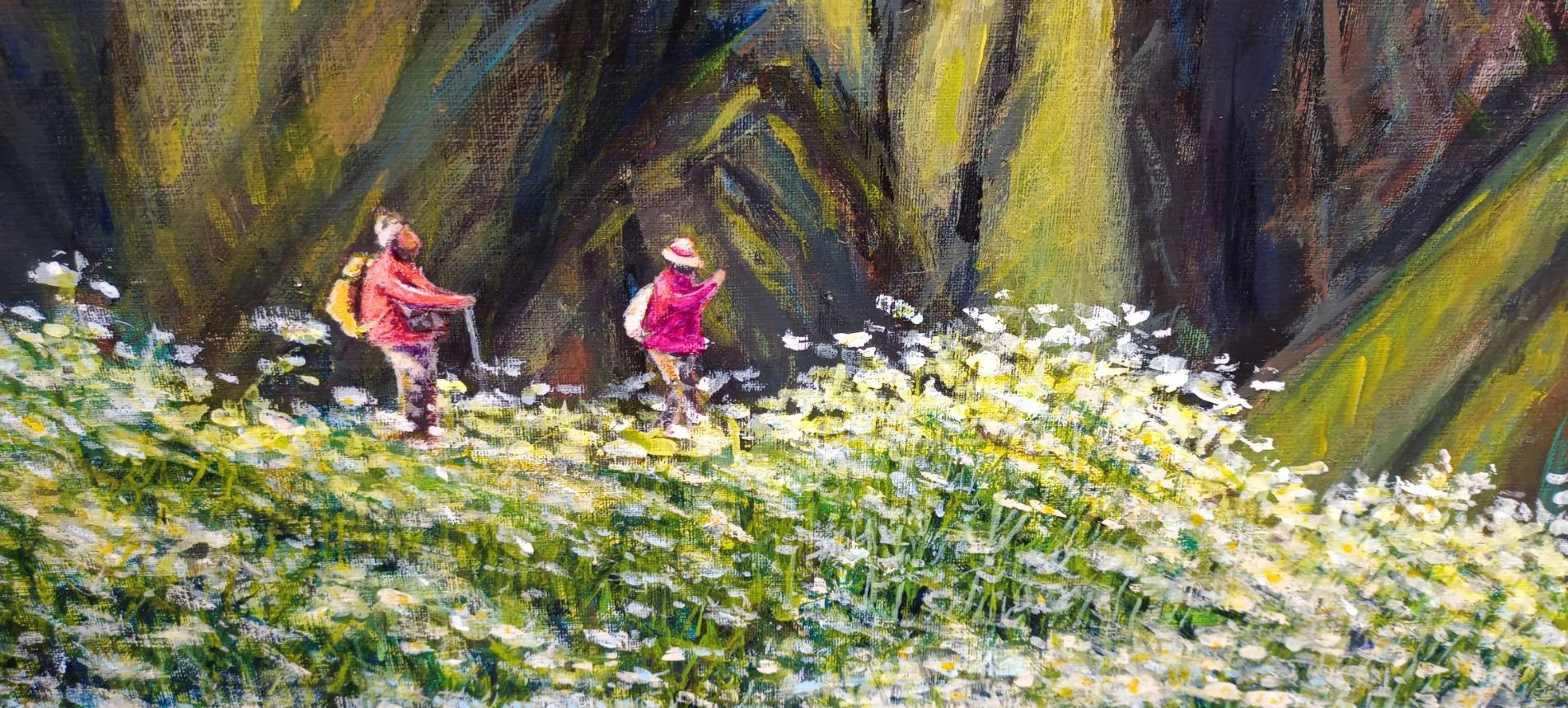 局部圖中人影是畫家將自己未爬過山的夫人一起畫入畫中,心意上帶她一起爬山賞山岳之美。