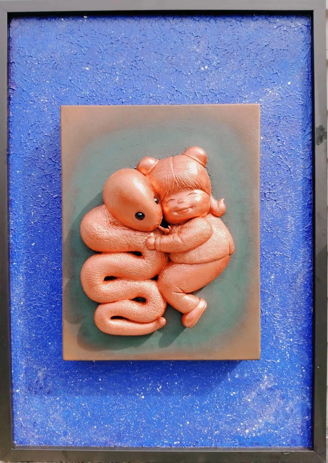 「與蛇共勉」創作發想:通常蛇給人的印象不佳~所以想顛覆蛇帶給人的刻板印象。創作小女孩與蛇的暖心親密擁