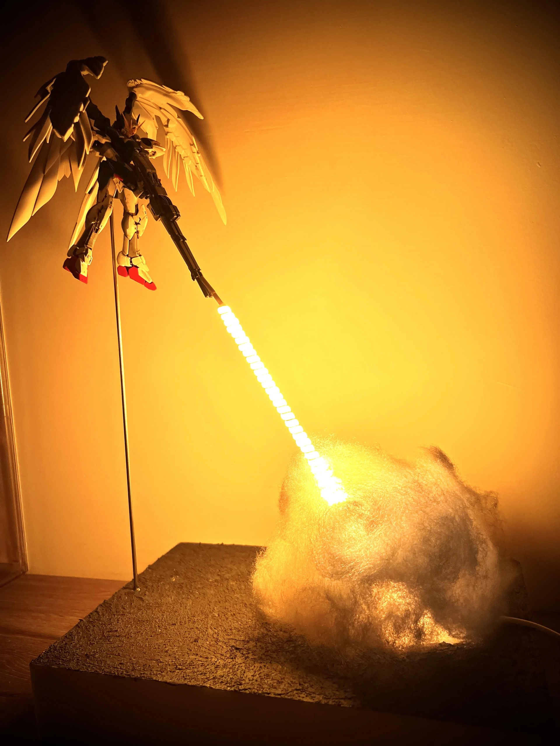 先將模型組裝完畢然後使用 0.2mm 刻線刀加深作品各處細節刻線,並使用黑色油性墨水使刻線上色,並貼上水貼,以上動作完畢後再噴上水性消光保護漆保護貼紙及提升模型質感,並且使用油性金色金屬色漆將鋼彈天線上色。